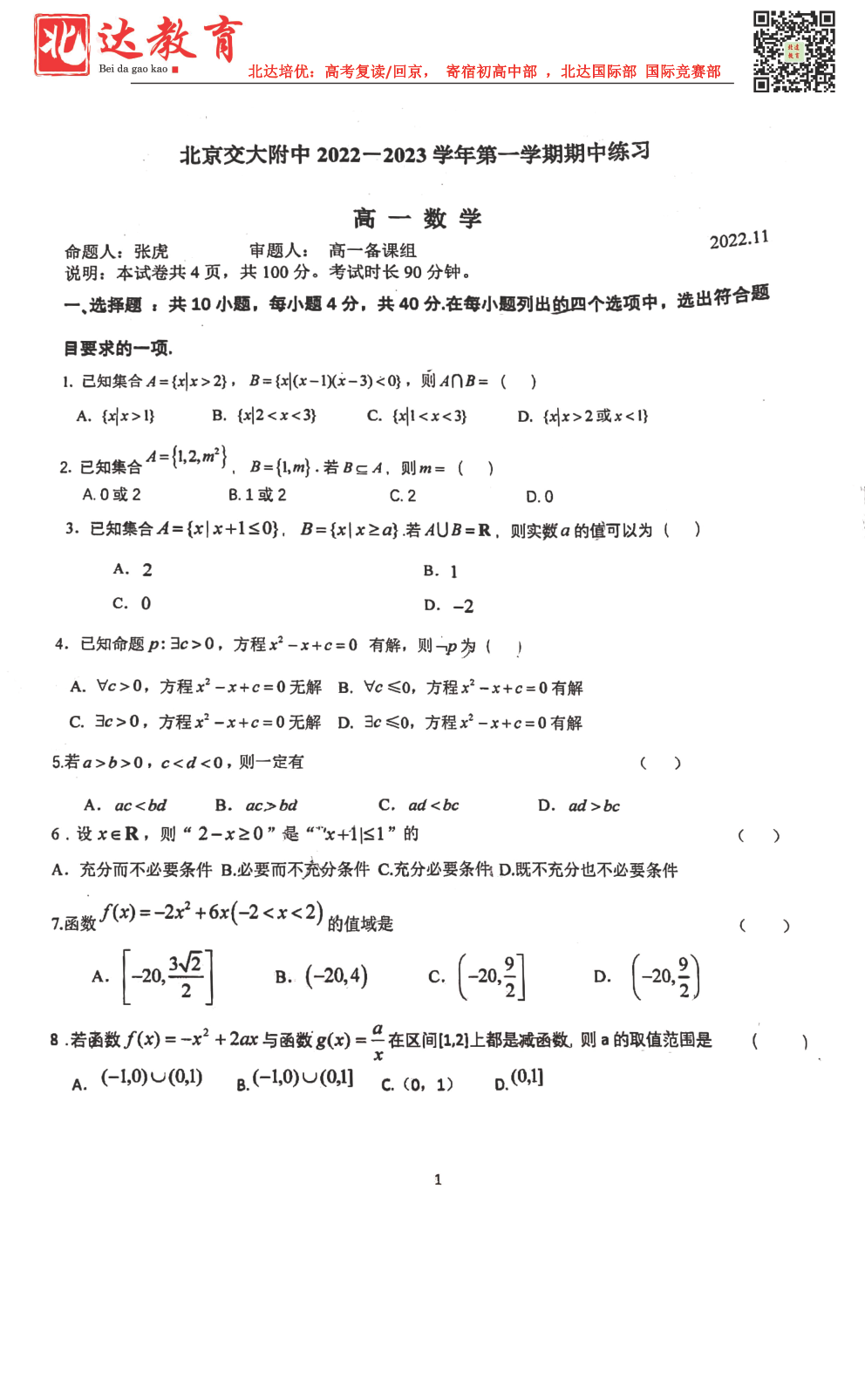 北京admw360教研组为大家整理了2022-2023学年北京交大附中高一(上)期中数学试题,分享给大家,赶紧下载练习起来吧。