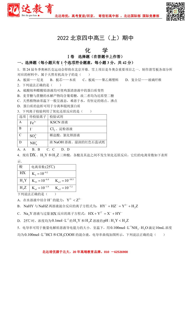 北京admw360教研组为大家整理了2022-2023学年北京四中高三上期中化学试题,分享给大家,赶紧下载练习起来吧。 admw360高中部:高复生,回京生,应届生,高一至高三寄宿招生简章 ★京籍高考…