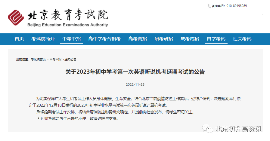 为切实保障广大考生和考试工作人员身体健康、生命安全,结合北京当前疫情防控工作实际,经综合研判,决定延期举行原定于2022年12月18日举行的2023年初中学业水平考试第一次英语听说计算机考试。
