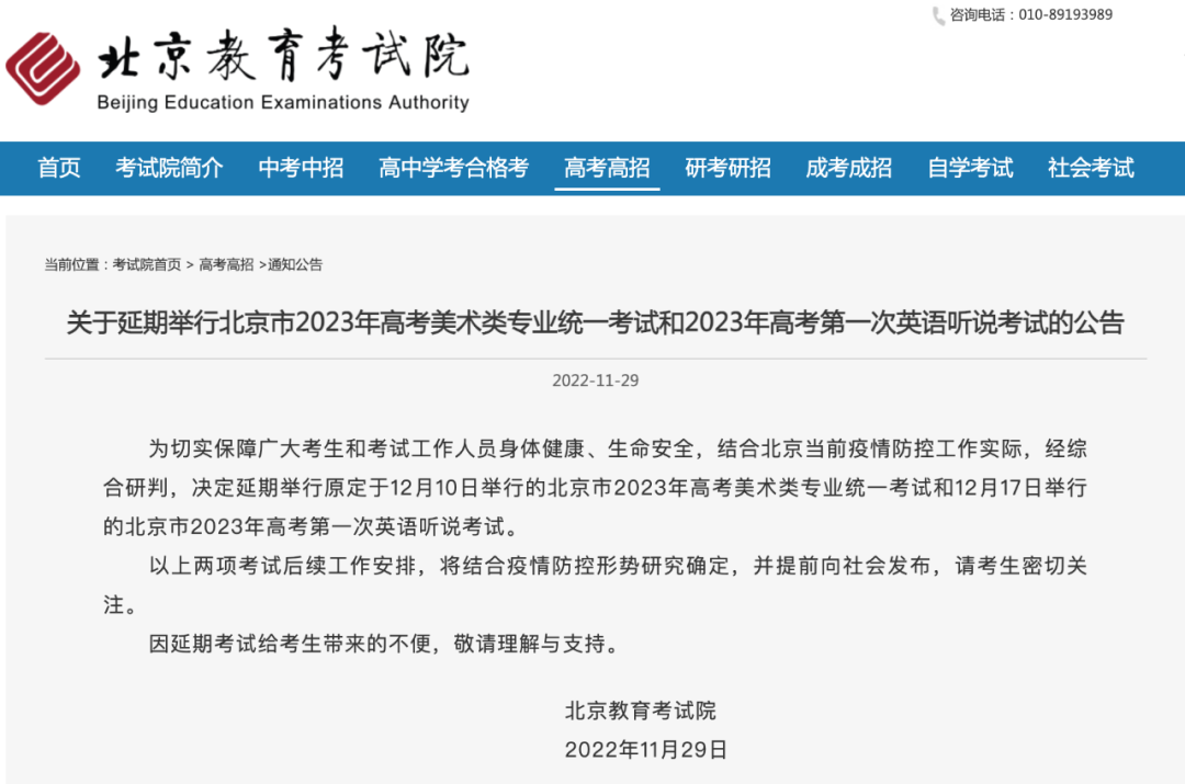 为切实保障广大考生和考试工作人员身体健康、生命安全,结合北京当前疫情防控工作实际,经综合研判,决定延期举行原定于12月10日举行的北京市2023年高考美术类专业统一考试和12月17日举行的北京市2023年高考第一次英语听说考试。
