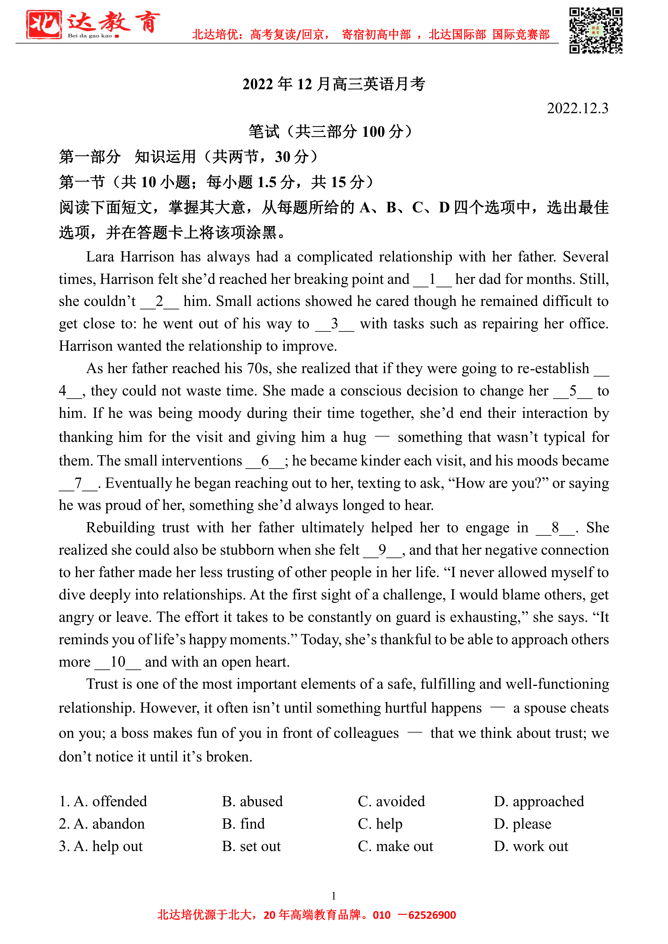 12月开始,北京市各区高中年级将陆续开展12月月考。admw360高考复读学校教研组整理了2023北京北师大实验中学高三12月月考英语试题及答案,附电子版可下载!