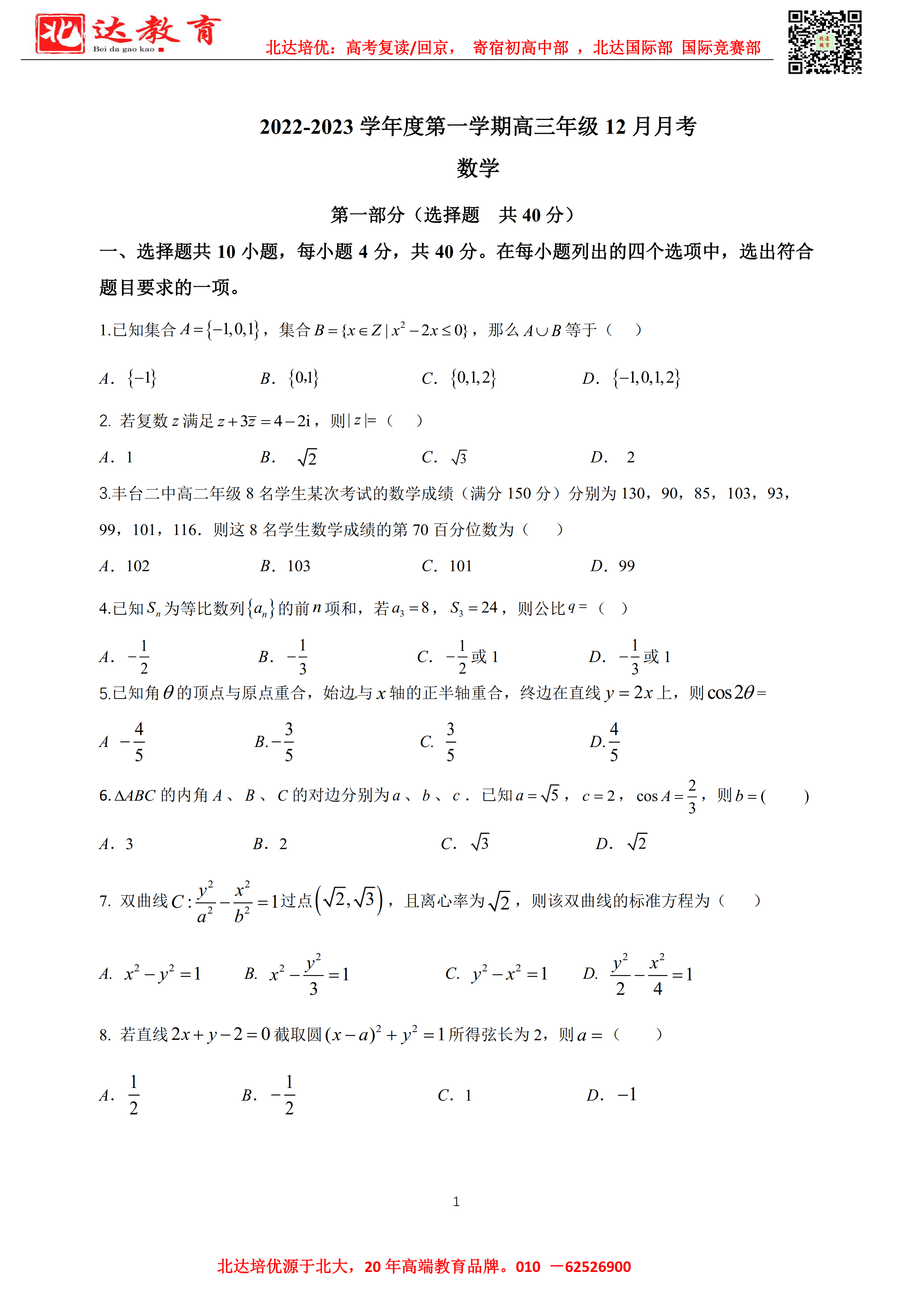12月开始,北京市各区高中年级将陆续开展12月月考。admw360高考复读学校教研组整理了2022丰台二中高三12月月考数学试题,附电子版可下载!