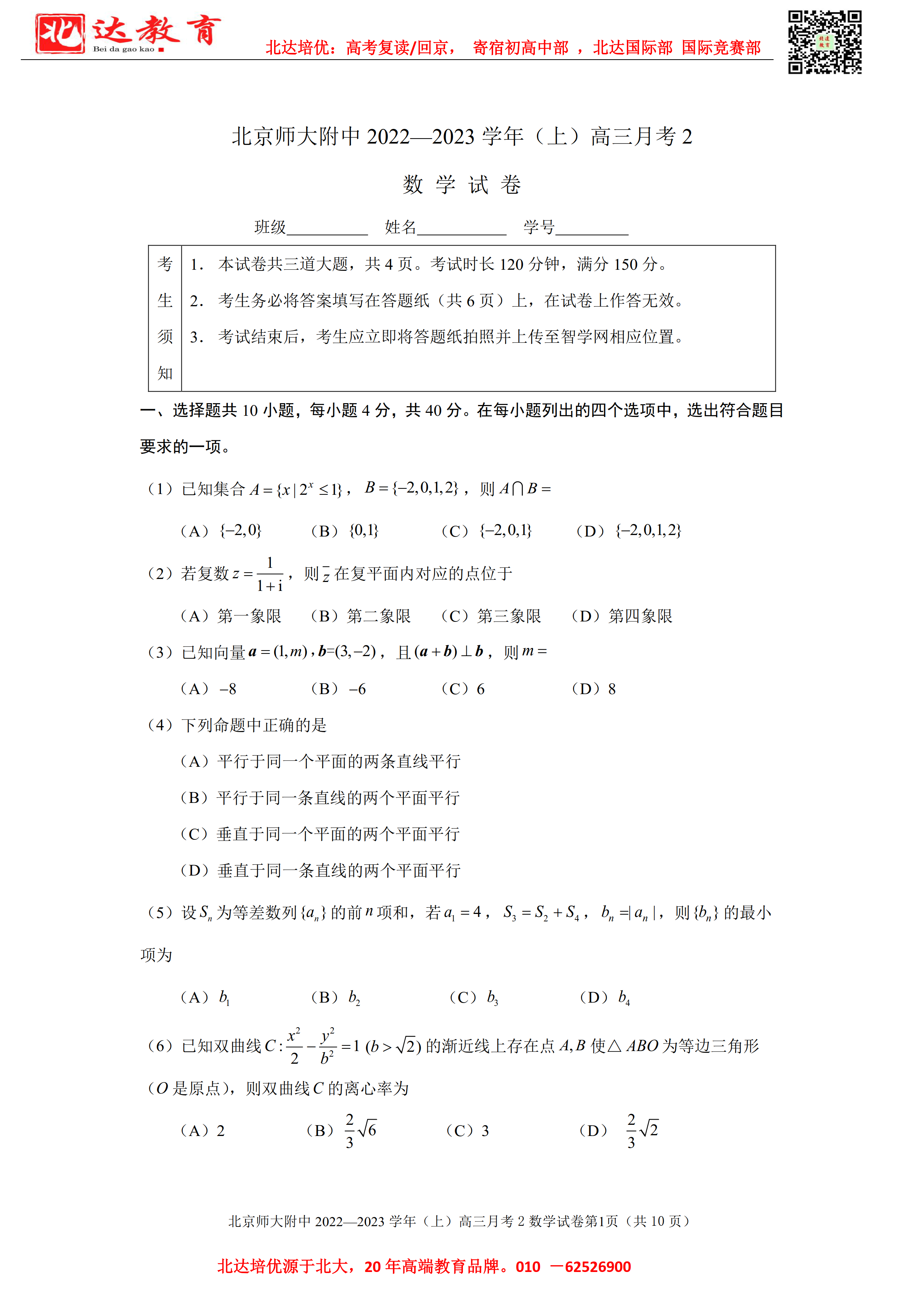 2022北师大附中高三12月月考数学试题,附电子版可下载!