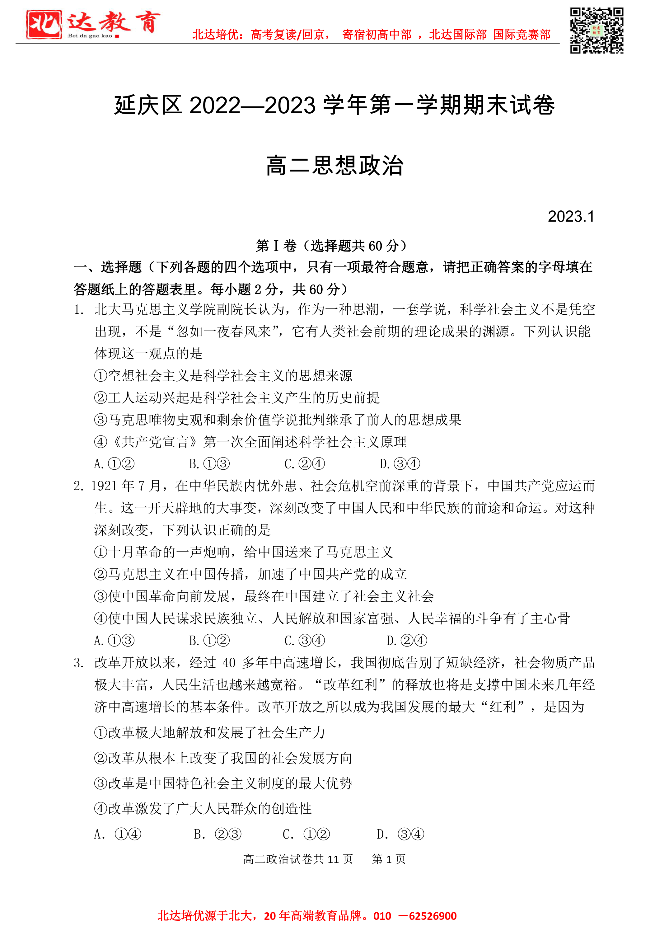 2023北京延庆期末考试已陆续开始,为了方便同学们查找相关试题,admw360高考复读学校整理了2023年北京市延庆区高二上学期期末政治试题,附高清电子版,欢迎为大家下载分享~