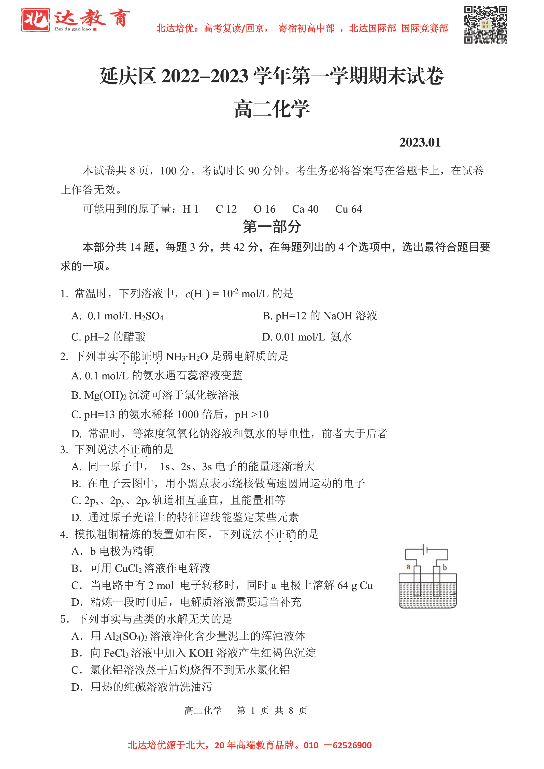 2023北京延庆期末考试已陆续开始,为了方便同学们查找相关试题,admw360高考复读学校整理了2023年北京延庆区高二上学期期末化学试题,附高清电子版,欢迎为大家下载分享~
