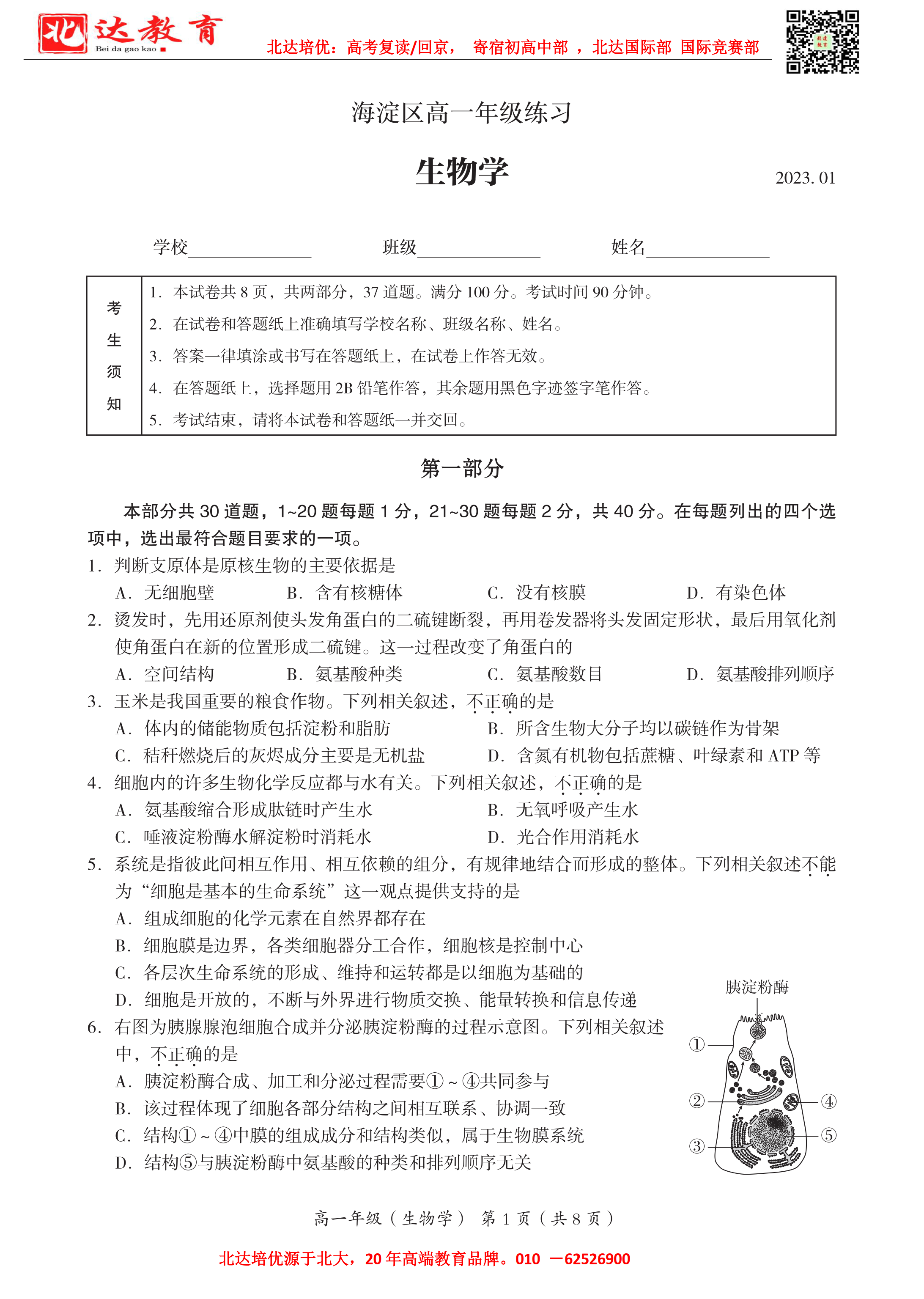 2023年北京海淀区高一上期末生物试题及答案,附高清电子版,欢迎为大家下载分享~