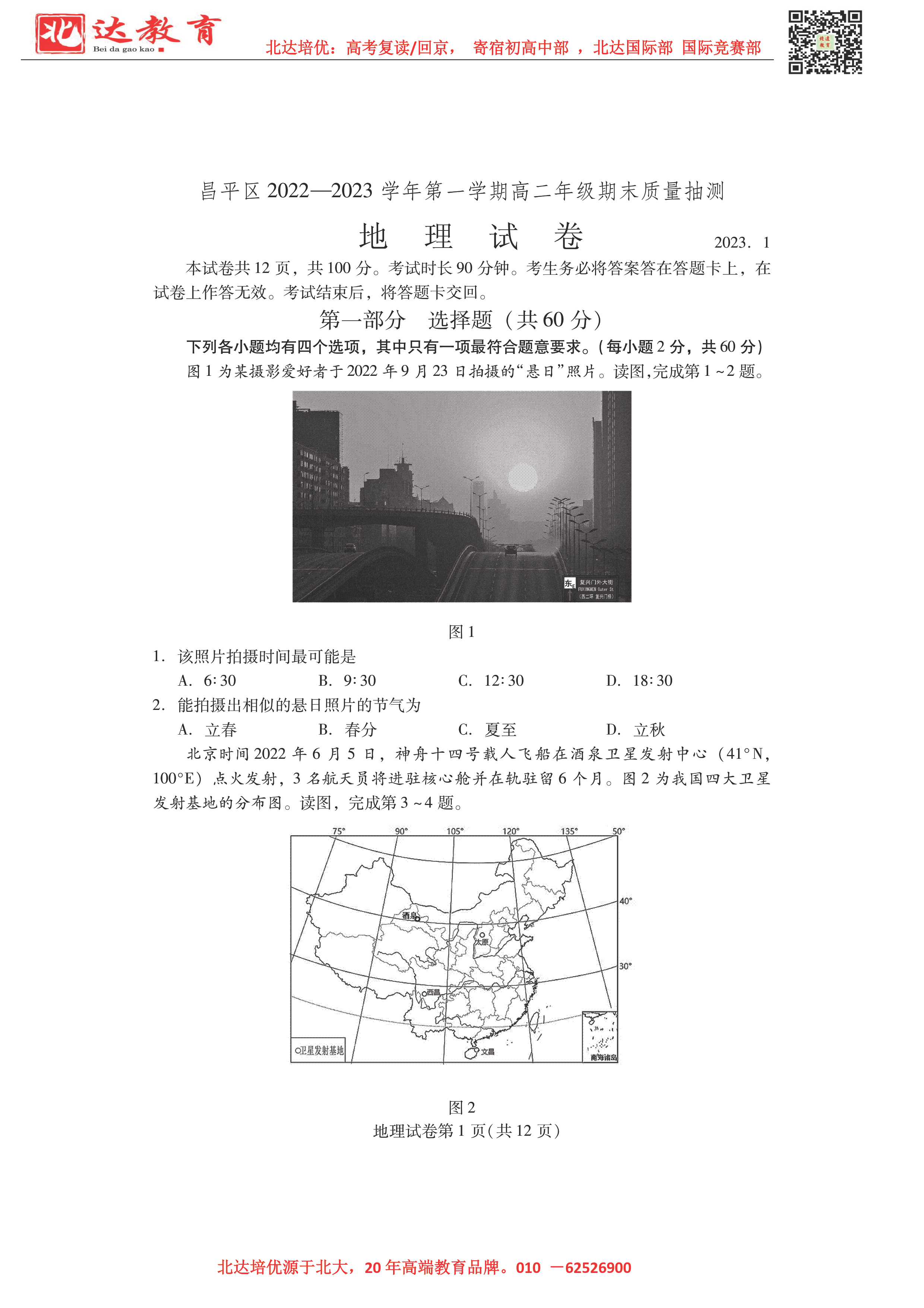 2023年北京昌平区高二上学期期末地理试题及答案,附高清电子版,欢迎为大家下载分享~