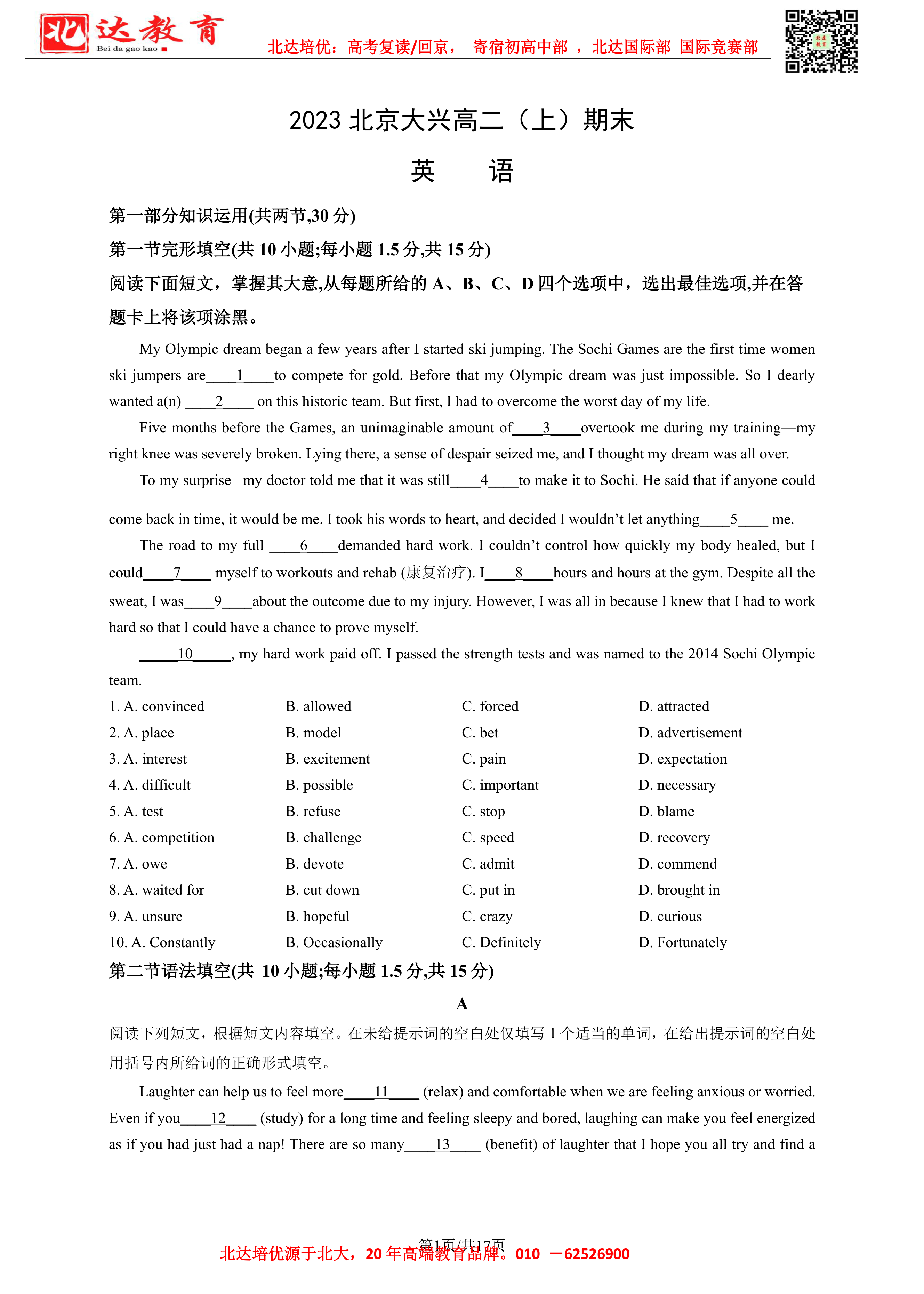 2023北京各区期末考试已陆续开始,为了方便同学们查找相关试题,admw360高考复读学校整理了2023年北京大兴区高二上学期期末英语试题及答案,附高清电子版,欢迎为大家下载分享~