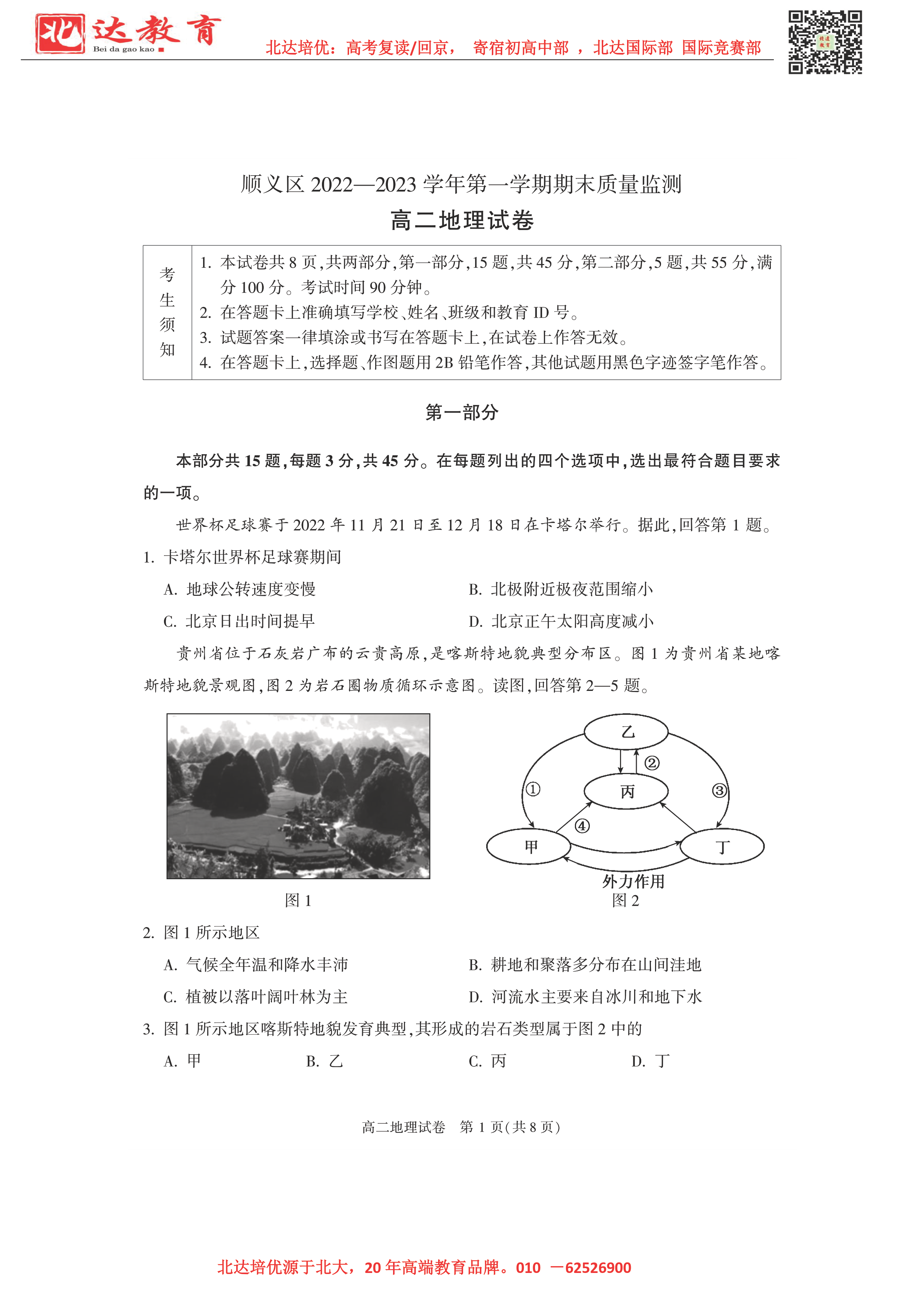 2023北京各区期末考试已陆续开始,为了方便同学们查找相关试题,admw360高考复读学校整理了2023年北京顺义区高二上学期期末地理试题及答案,附高清电子版,欢迎为大家下载分享~