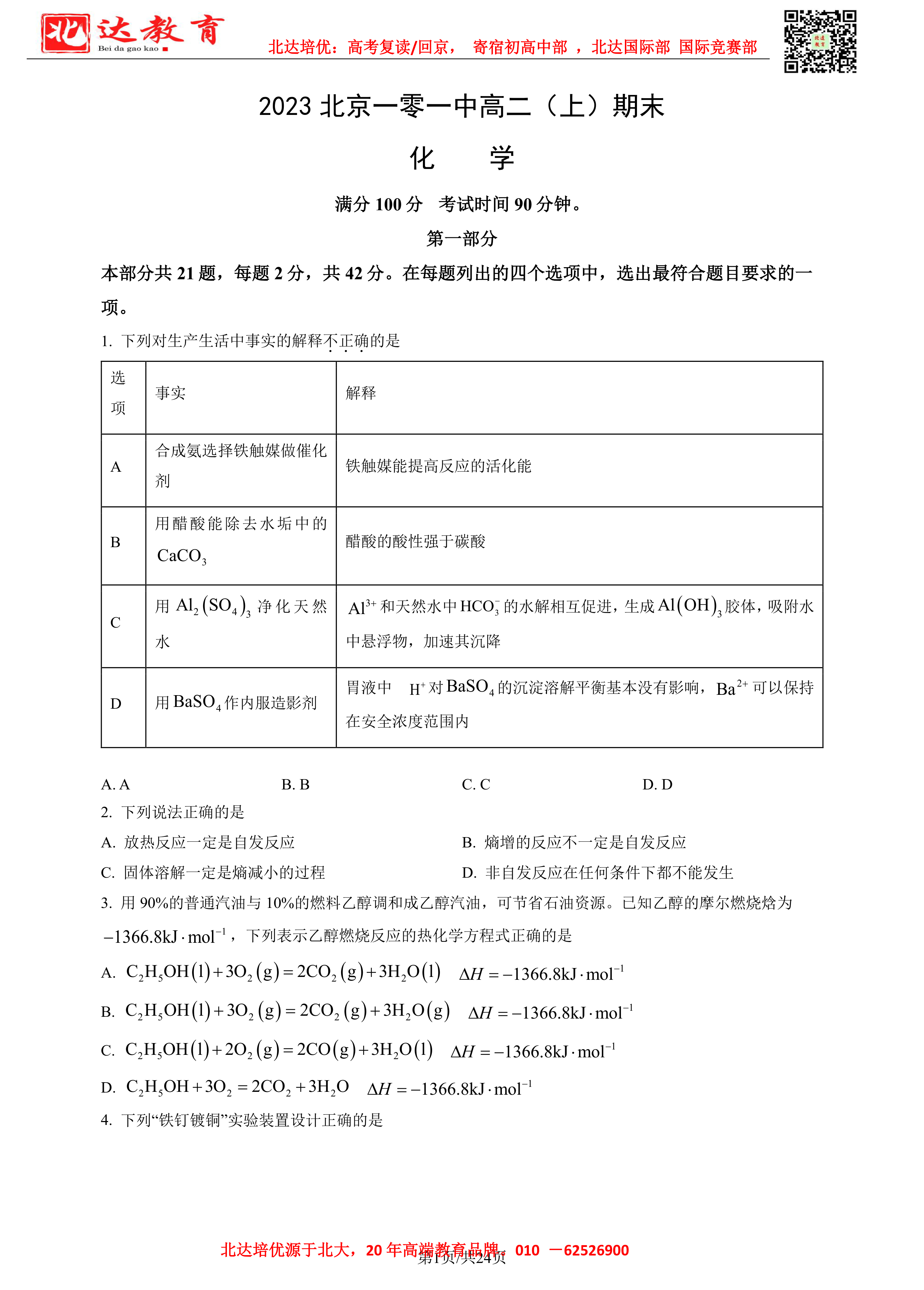 2023北京各区期末考试已陆续开始,为了方便同学们查找相关试题,admw360高考复读学校整理了2023年北京一零一中高二上学期期末化学试题及答案,附高清电子版,欢迎为大家下载分享~