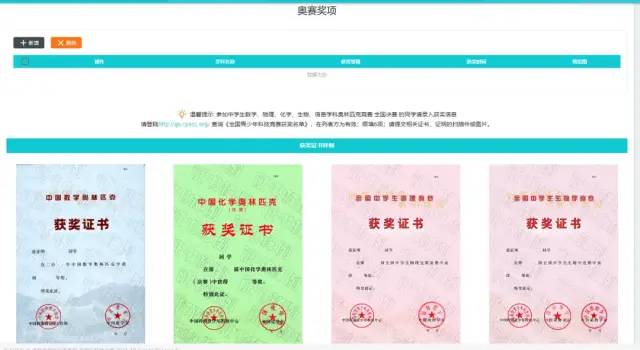 注意:此页仅限填写五大奥赛全国决赛获奖经历,无此项获奖经历的考生可跳过。页面下方有五大奥赛全国决赛获奖证书样例供参考甄别。