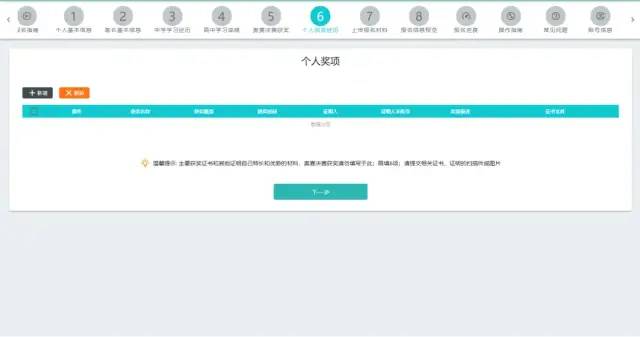 录入除奥赛全国决赛获奖外的其他个人获奖经历(包括省级奥赛奖项)、特长证明材料,并上传证书扫描件;限填6项。