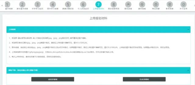 高中成绩表:可使用报名系统下载的模板,也可使用中学出具的成绩单。如使用系统提供模板,请先在前述第四步【高中学习成绩】页录入完整信息后再下载“成绩表模板”,下载的模板上会自动生成已录入的成绩信息,可直接打印并交中学进行盖章。请勿直接下载空白成绩表模板。高中成绩表上传支持图片格式和PDF文件格式,大小在5MB以内。