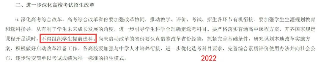 2022年教育部通知中只是模糊提出,不得组织学生提前选科。