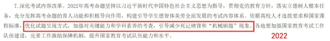 关于高考命题方向,2022年的说法是:优化试题呈现方式,加强对关键能力和学科素养的考查,引导减少死记硬背和“机械刷题”现象。