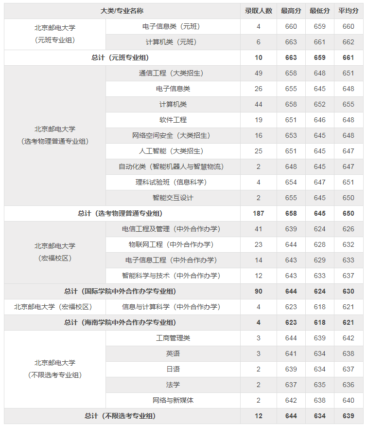 北京邮电大学2022在京各专业录取分数线