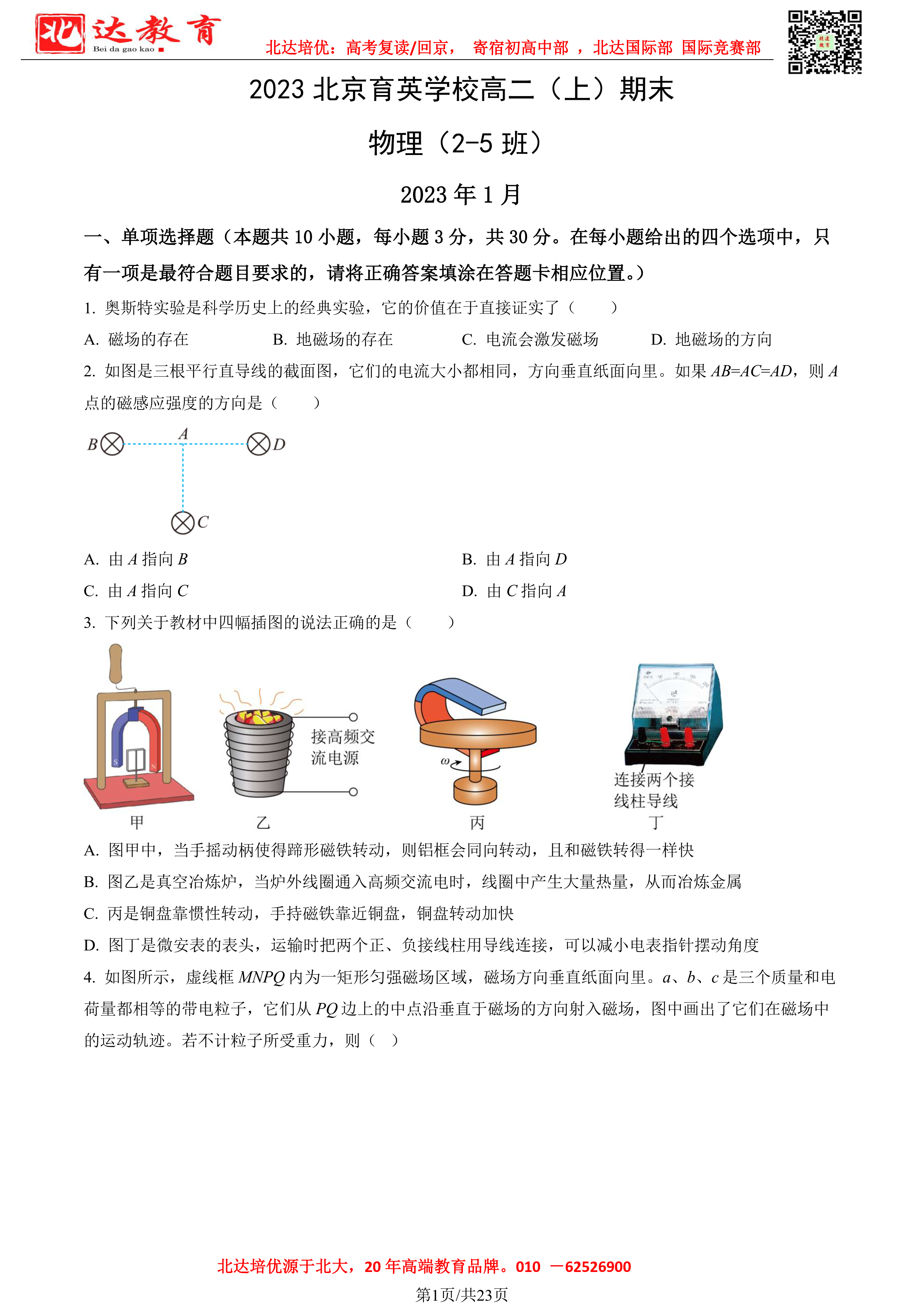 2023北京各区期末考试已陆续开始,为了方便同学们查找相关试题,admw360高考复读学校整理了2023年北京育英学校高二上学期期末物理试题及答案,附高清电子版,欢迎为大家下载分享~