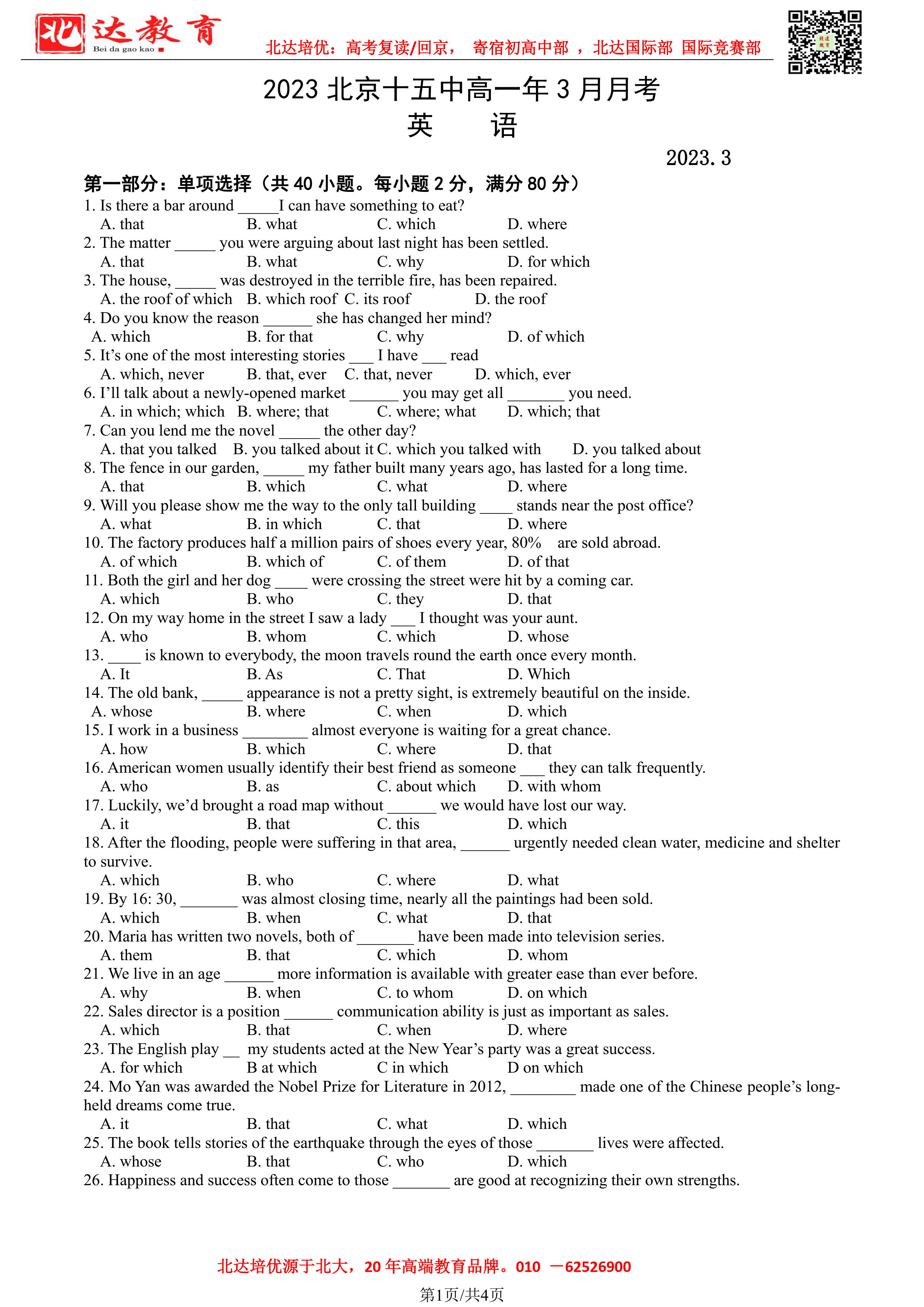 2023北京各区高一3月月考正进行中,admw360高考复读学校整理了2023北京十五中高一3月月考英语试题,同学们可以在线下载学习!