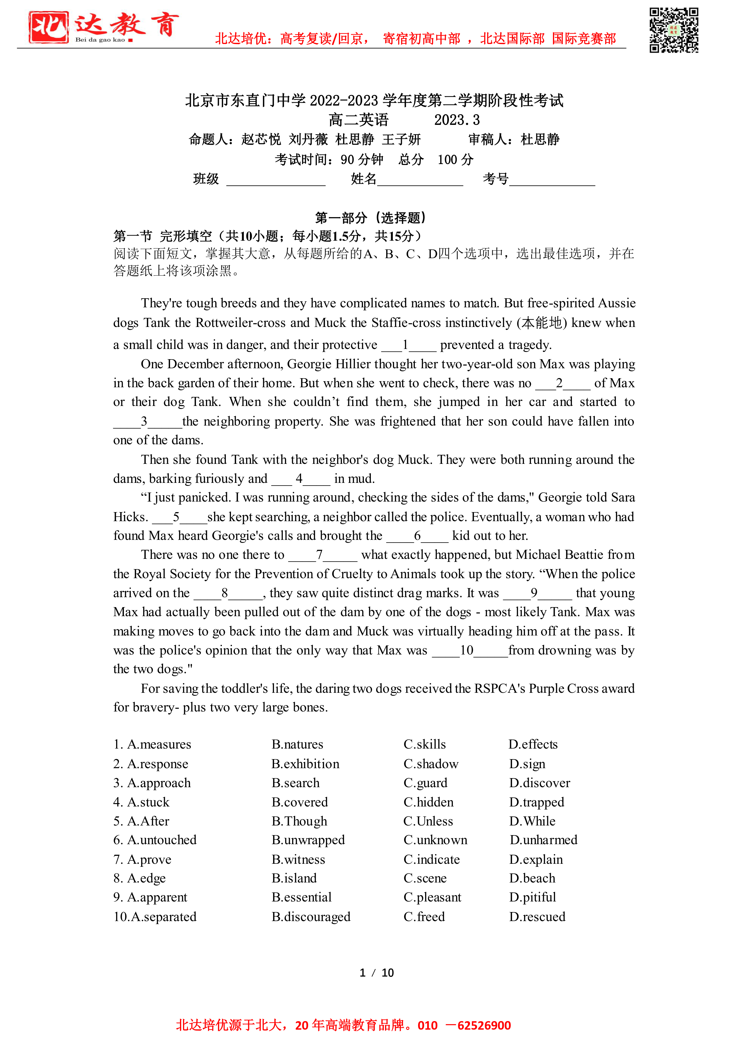 2023北京各区高二3月月考正进行中,admw360高考复读学校整理了2023北京东直门中学高二3月月考英语试题,同学们可以在线下载学习!