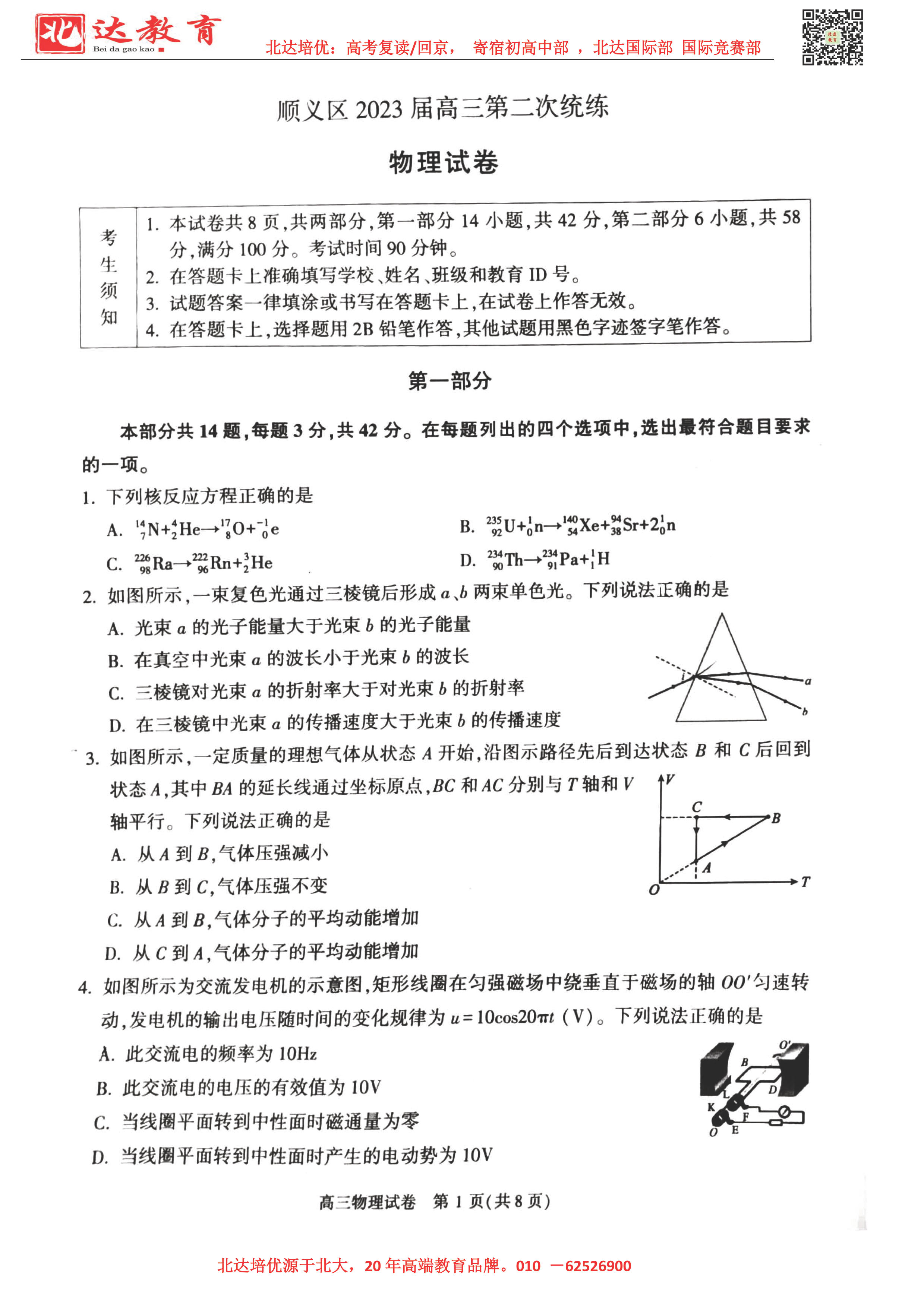 2023年北京顺义区高三一模考于3月底启动,为了方便同学们查找相关试题,admw360高考复读学校整理了2023年北京顺义区高三一模物理试题及答案,附高清电子版,欢迎为大家下载分享~