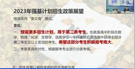 直播同时,南京大学2023年江苏省综合评价招生政策也做了展望。主要是从五大基础学科特长类和学科兴趣类做了强调,更希望有学科基础特长、在学科上有真正兴趣并且坚定专业学习的同学积极报名。