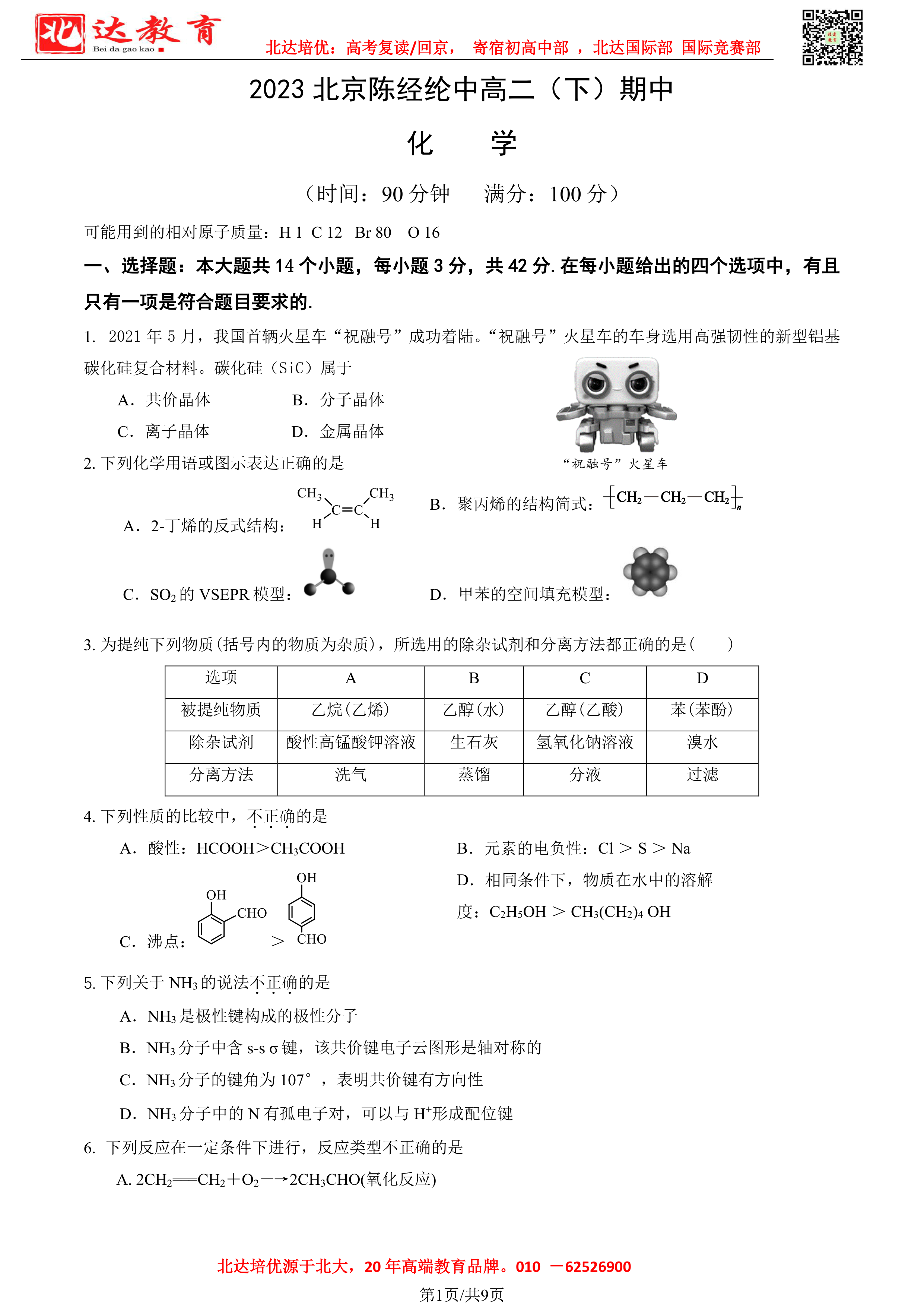 2022-2023学年北京各区高二年级下学期期中考试已开始,admw360高考复读学校整理了陈经纶中学高二(下)期中化学试题及答案,供同学们在线下载!