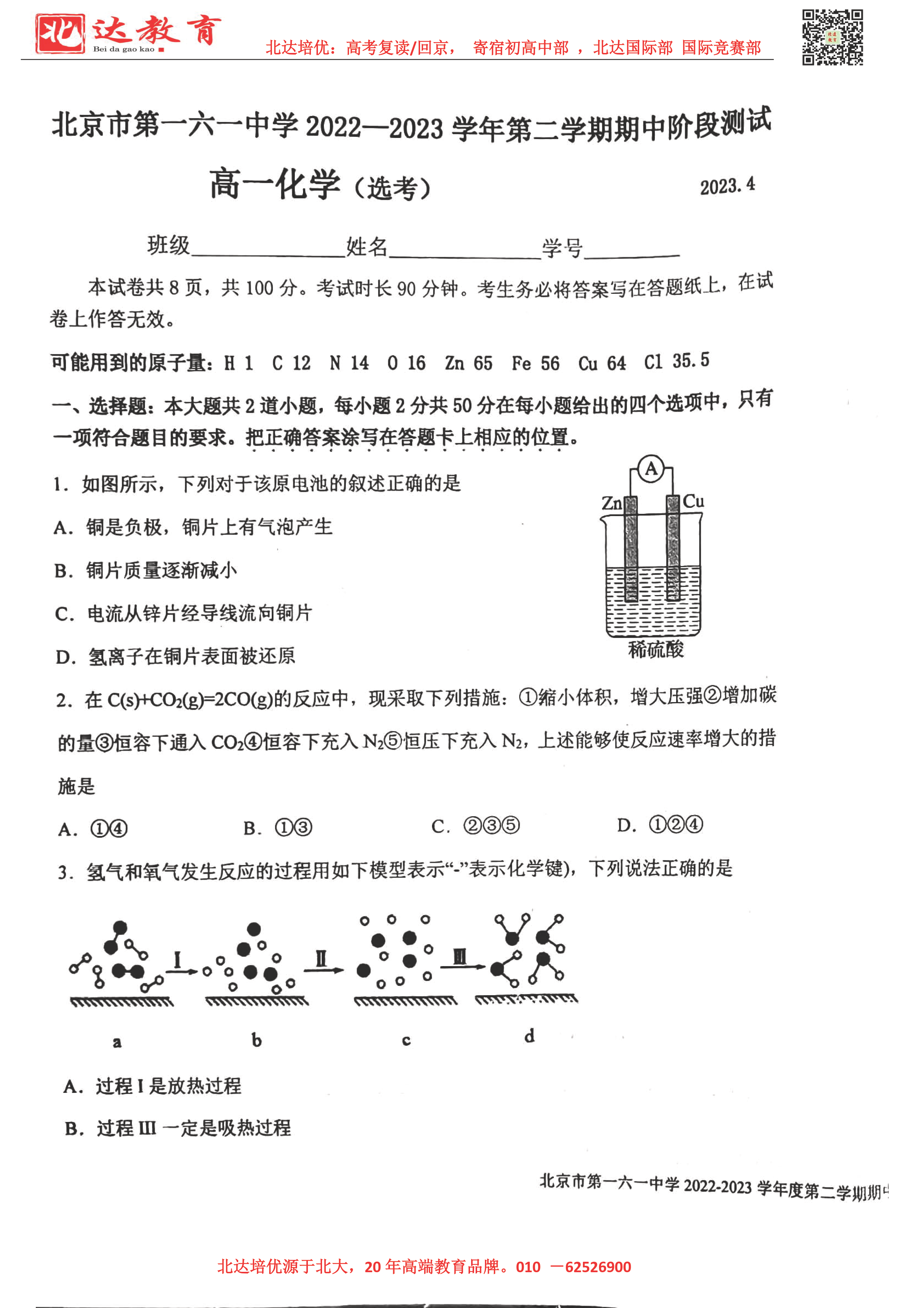 2022-2023学年北京各区高一年级下学期期中考试已开始,admw360高考复读学校整理了2022-2023学年北京一六一中高一(下)期中化学试题及答案,供同学们在线下载!