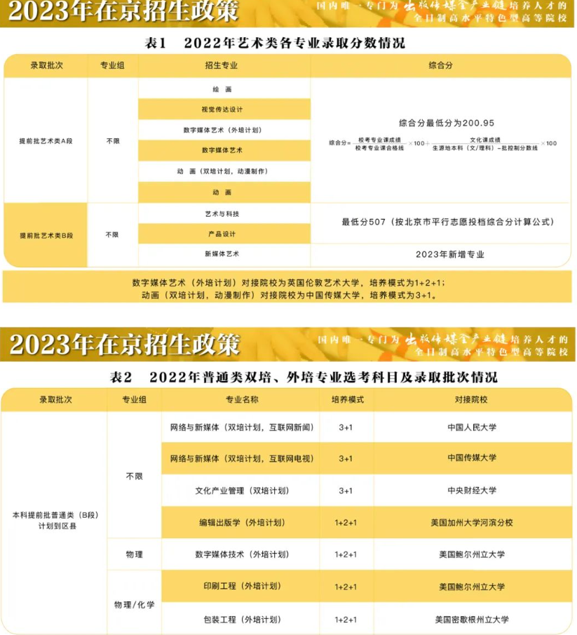 2022年在京招生计划是471人,2023年我校将大幅增加在京招生计划。27个招生专业(含3个实验班),新增新媒体艺术专业,部分专业采用大类招生。学校的特色专业编辑出版学、数字出版、印刷工程、包装工程等将不再以新闻传播学类、轻工类大类招生,按专业直接报考。