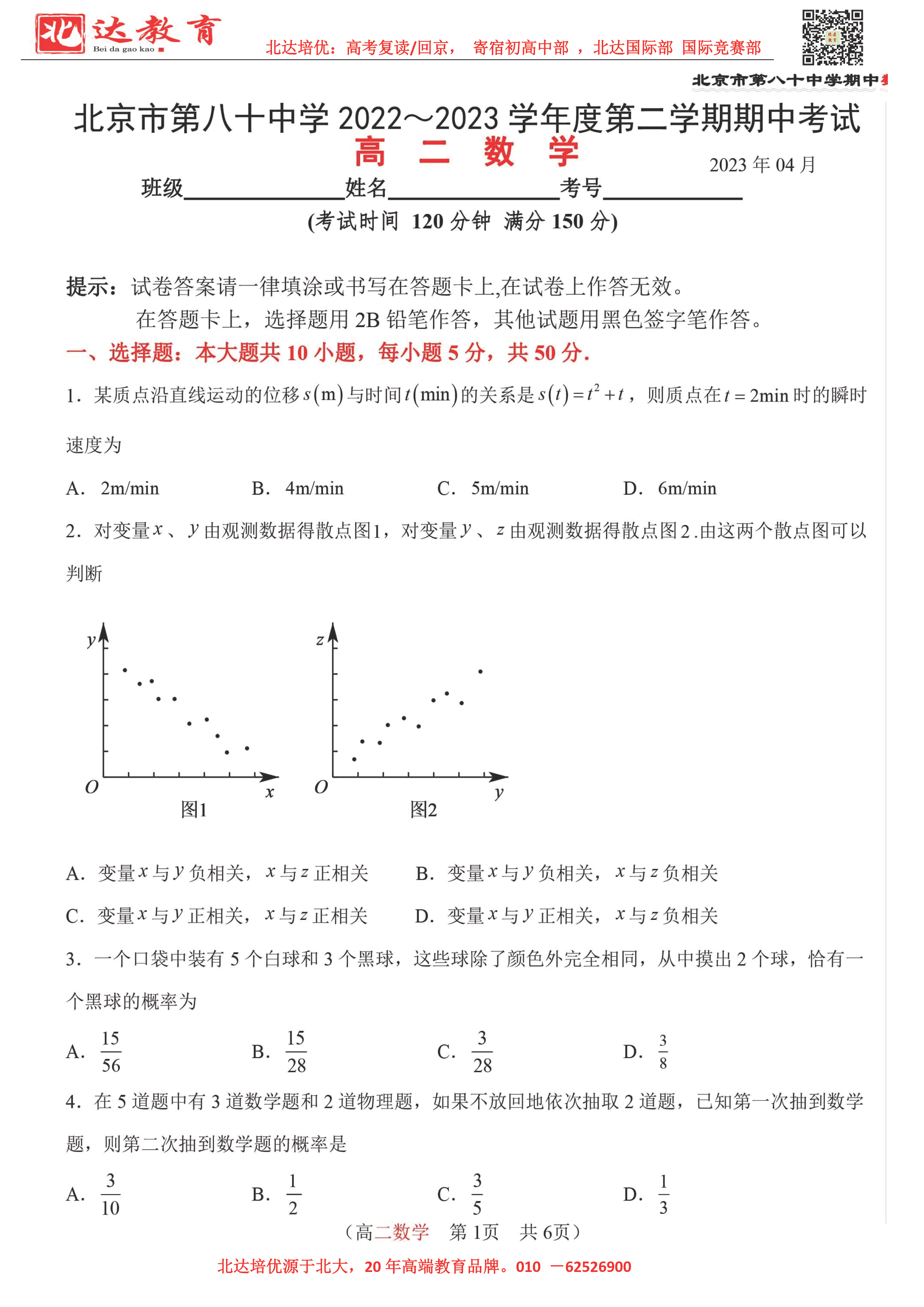 2022-2023学年北京各区高二年级下学期期中考试已开始,admw360高考复读学校整理了2022-2023学年北京八十中高二(下)期中数学试题,供同学们在线下载!
