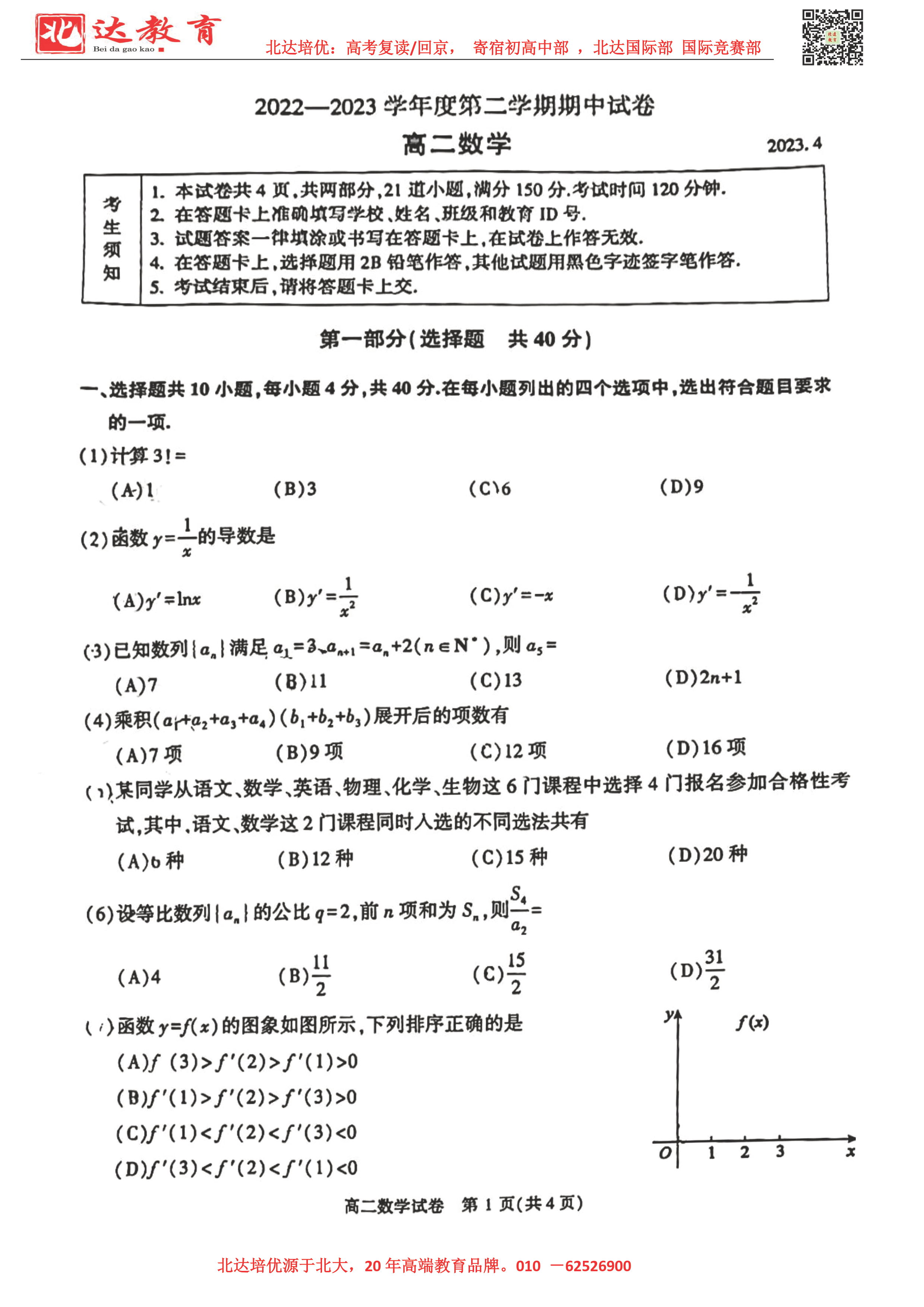 2022-2023学年北京各区高二年级下学期期中考试已开始,admw360高考复读学校整理了2022-2023学年北京顺义高二(下)期中数学试题及答案,供同学们在线下载!