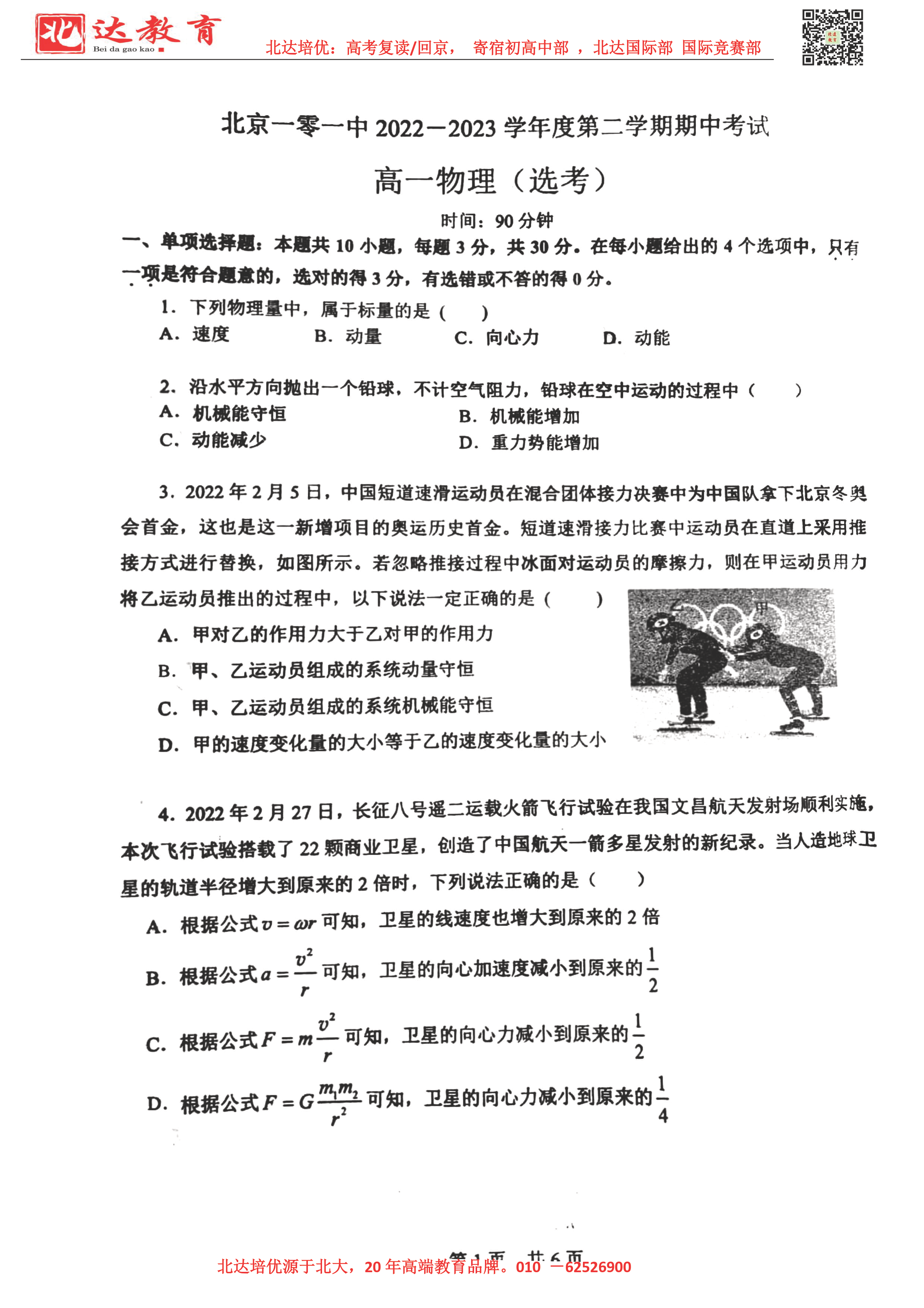 2022-2023学年北京各区高一年级下学期期中考试已开始,admw360高考复读学校整理了2022-2023学年北京一零一中高一(下)期中物理试题,供同学们在线下载!