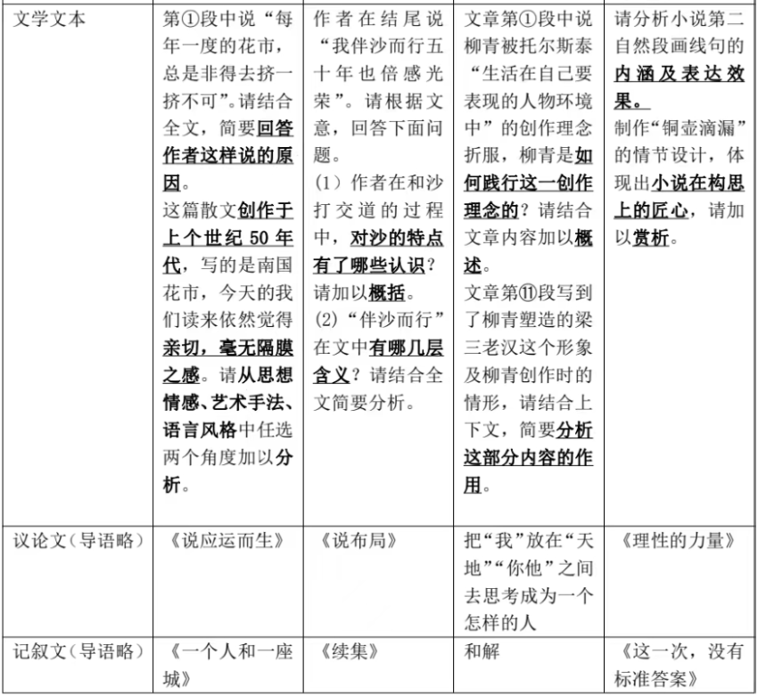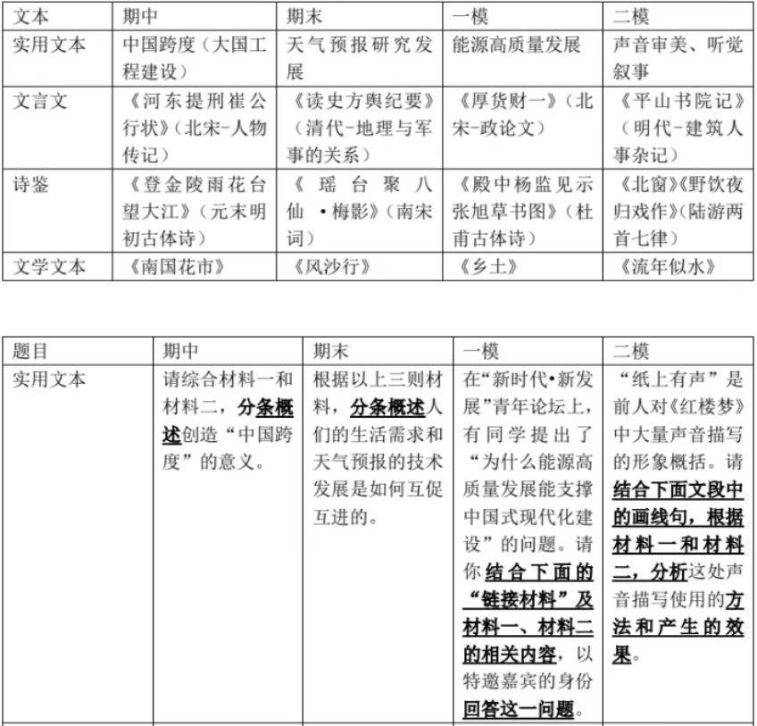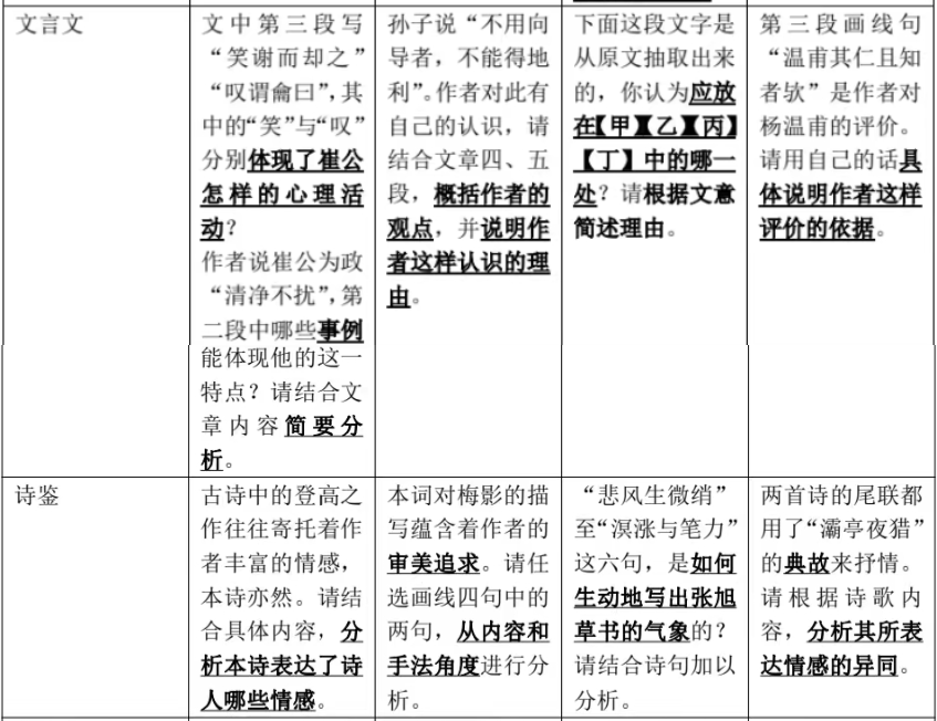 而就命题而言,实用文本考查信息提炼和结合链接材料解决问题各占一半;文言文以原文信息理解概括为主,兼顾对文本层次结构的分析;诗歌鉴赏考过情感分析、审美鉴赏、写法探究、情感对比,涉及内容、手法、典故、艺术特色等要素;文学文本信息概括、含义解读、作用分析、艺术鉴赏等常规题型均有出现;整本书阅读也同样包含了原著信息记忆与理解和写作特色鉴赏两大方面。