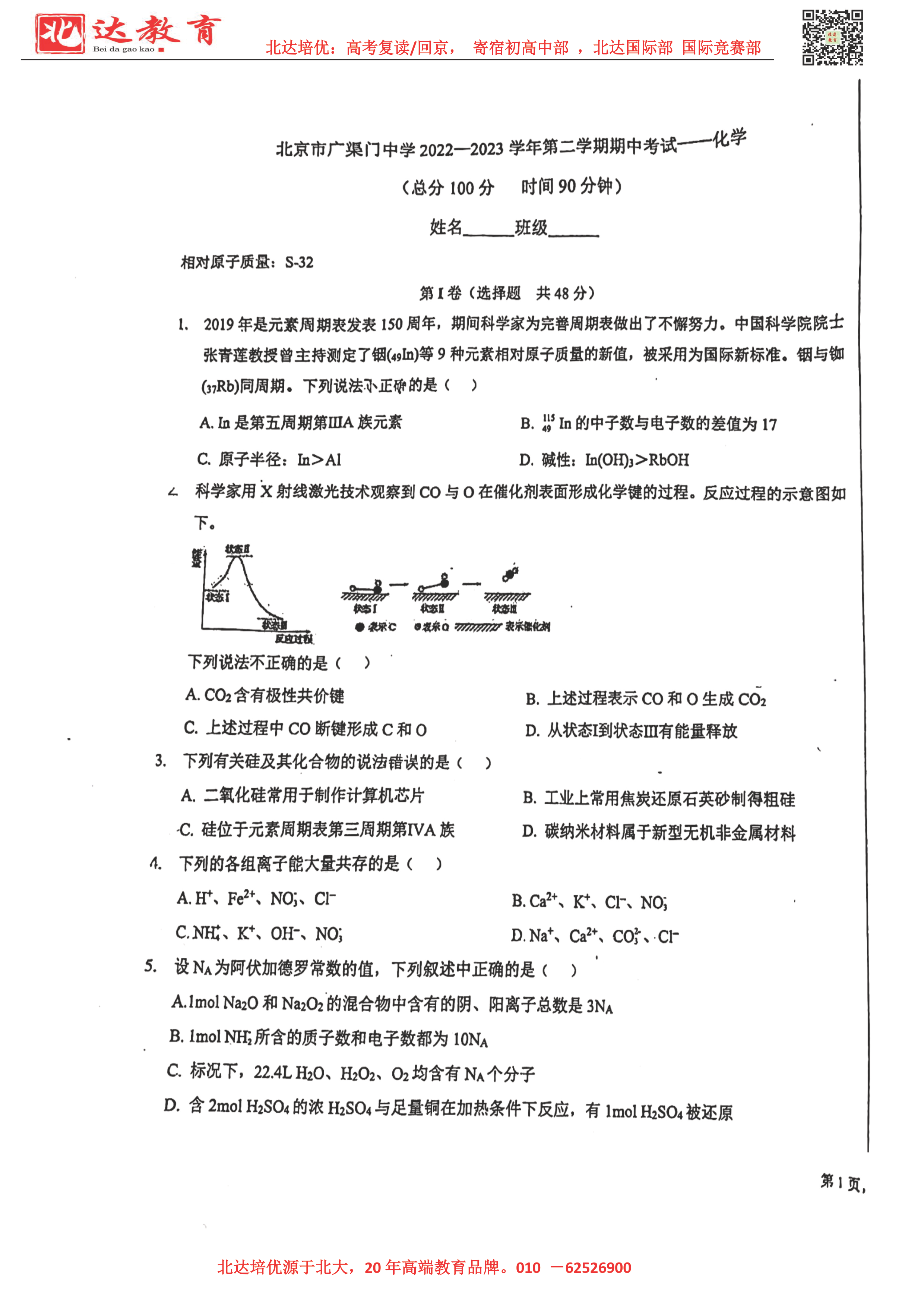 2022-2023学年北京各区高一年级下学期期中考试已开始,admw360高考复读学校整理了2022-2023学年北京广渠门高一(下)期中化学试题,供同学们在线下载!