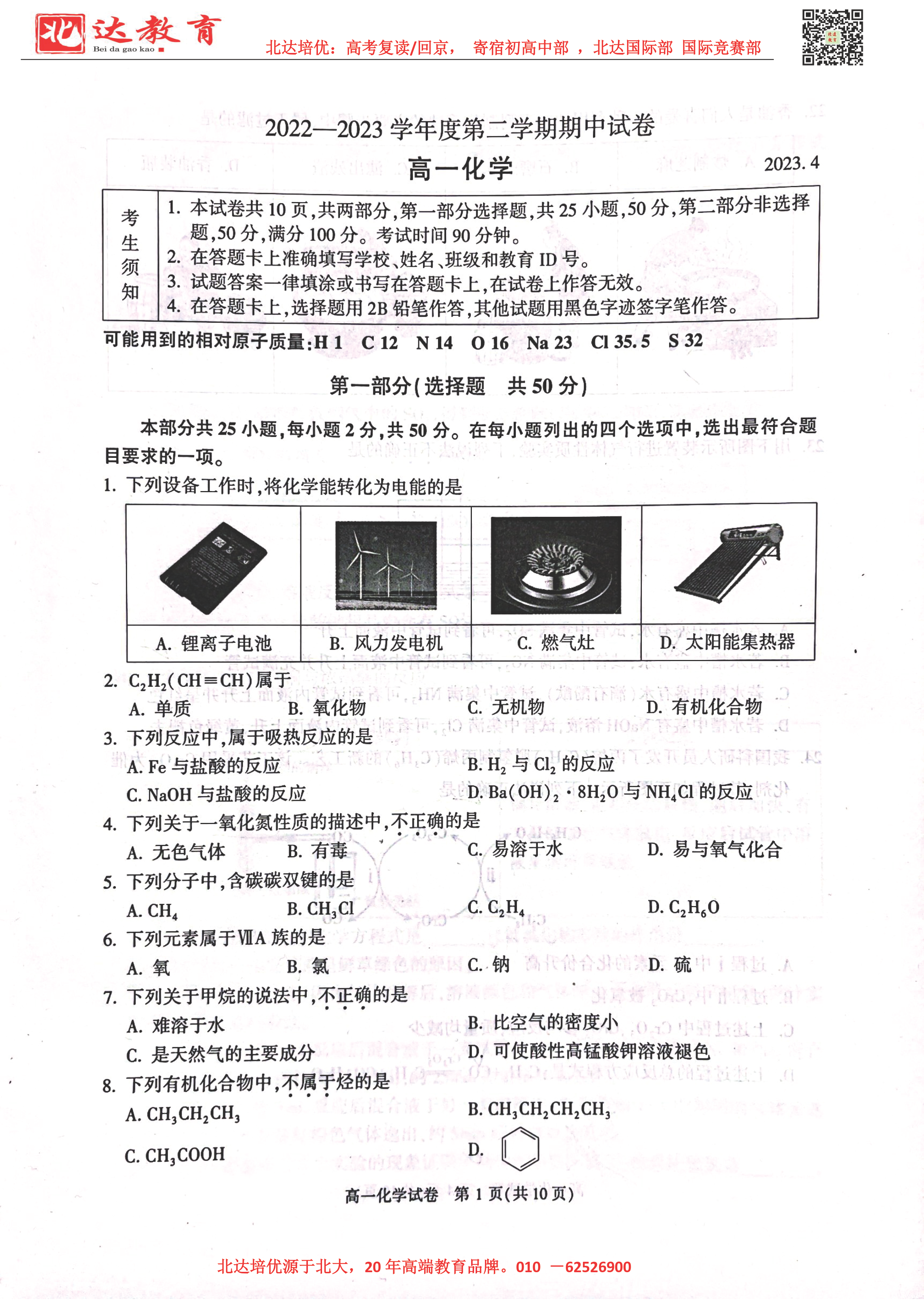 2022-2023学年北京各区高一年级下学期期中考试已开始,admw360高考复读学校整理了2022-2023学年北京顺义高一(下)期中化学试题,供同学们在线下载!
