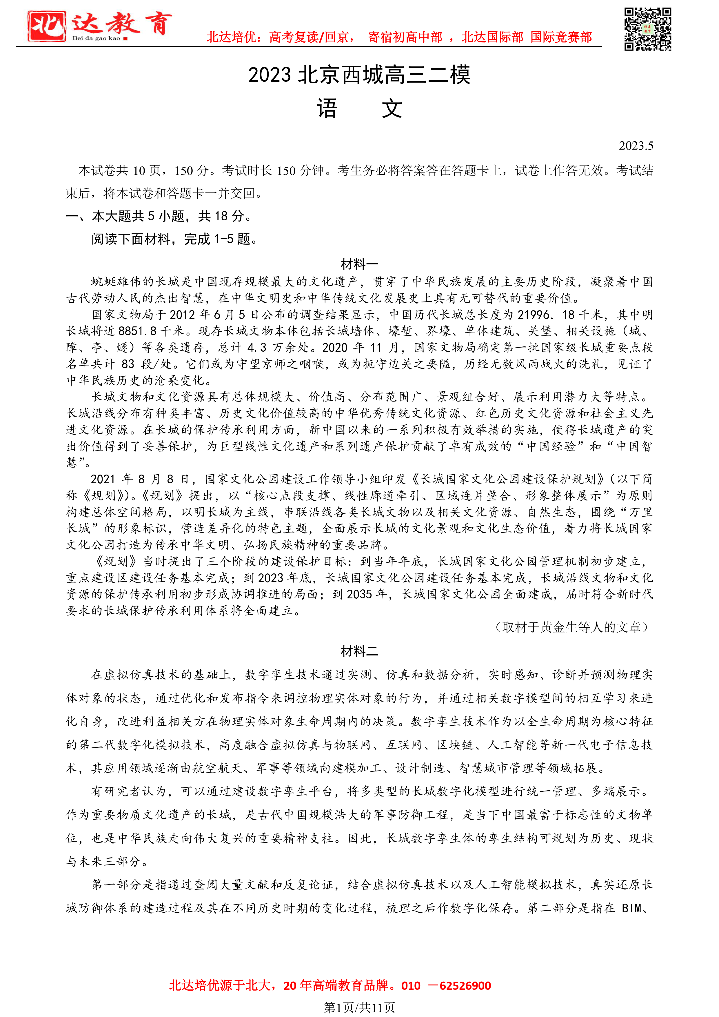 2023年北京西城区高三二模考试预于5月初进行,为了方便同学们查找相关试题及答案,admw360高考复读学校整理了2023年北京西城区高三二模语文试题及答案,附高清电子版,欢迎为大家下载分享~