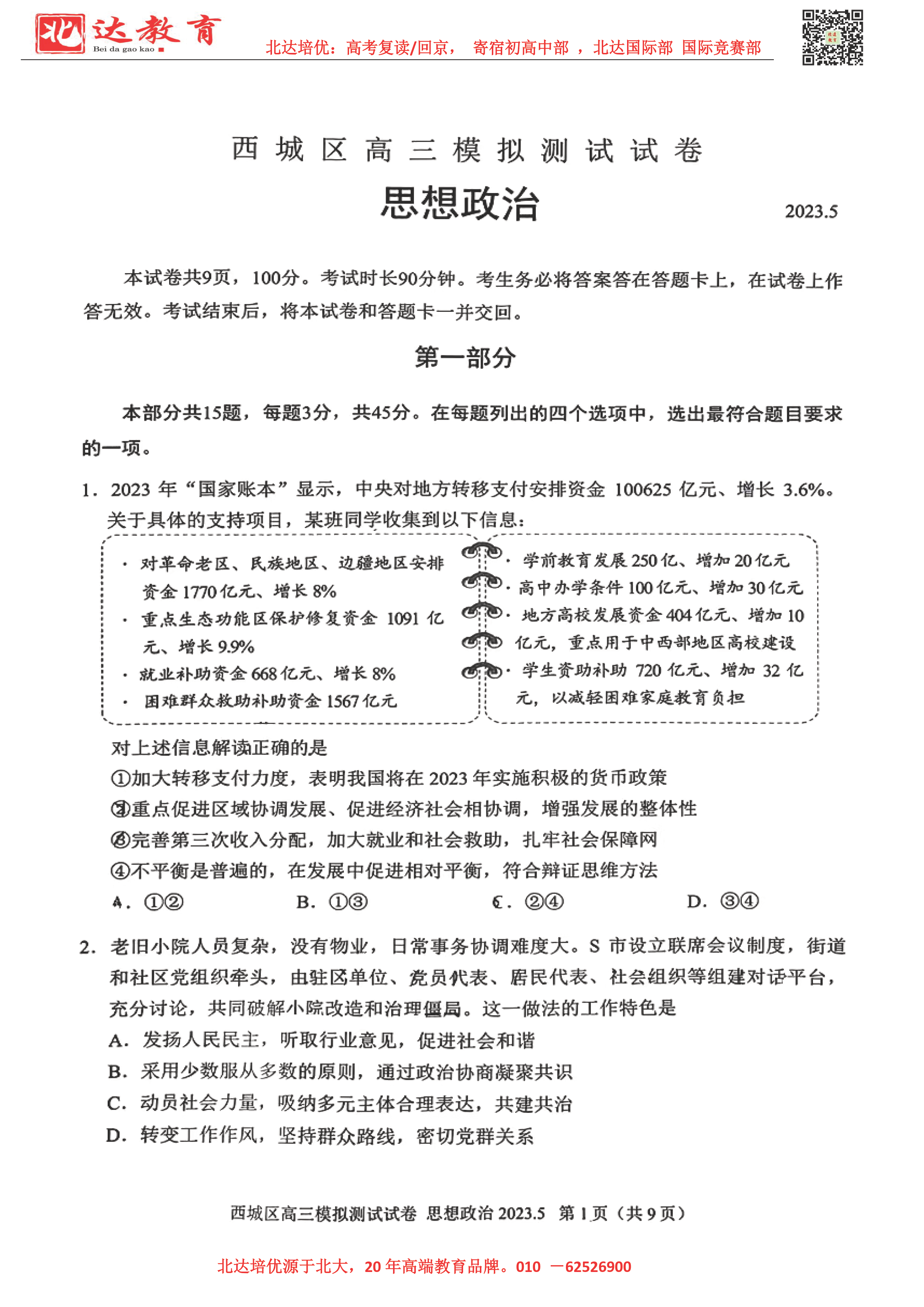 2023年北京西城区高三二模考试预于5月初进行,为了方便同学们查找相关试题及答案,admw360高考复读学校整理了2023年北京西城区高三二模政治试题及答案,附高清电子版,欢迎为大家下载分享~