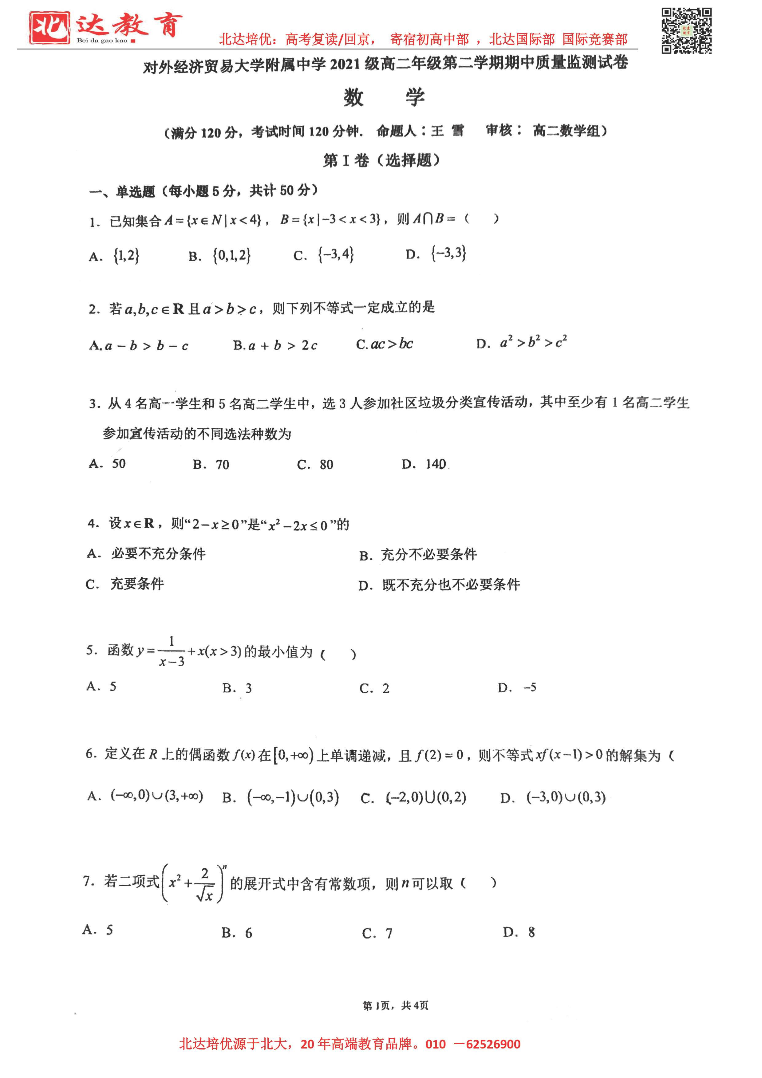 2022-2023学年北京各区高二年级下学期期中考试已开始,admw360高考复读学校整理了2022-2023学年北京贸大附中高二(下)期中数学试题及答案,供同学们在线下载!