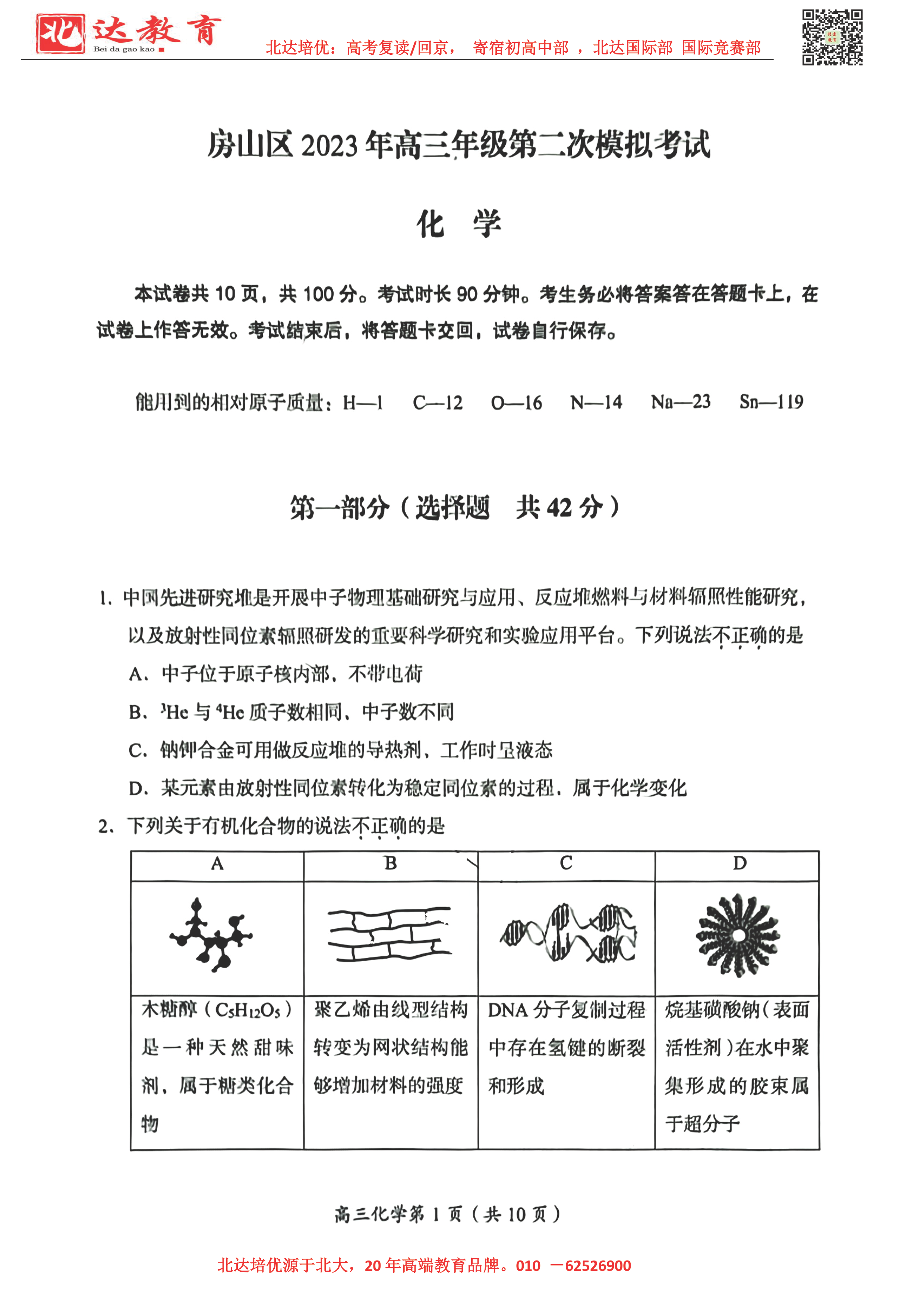 2023年北京房山区高三二模化学试题及答案