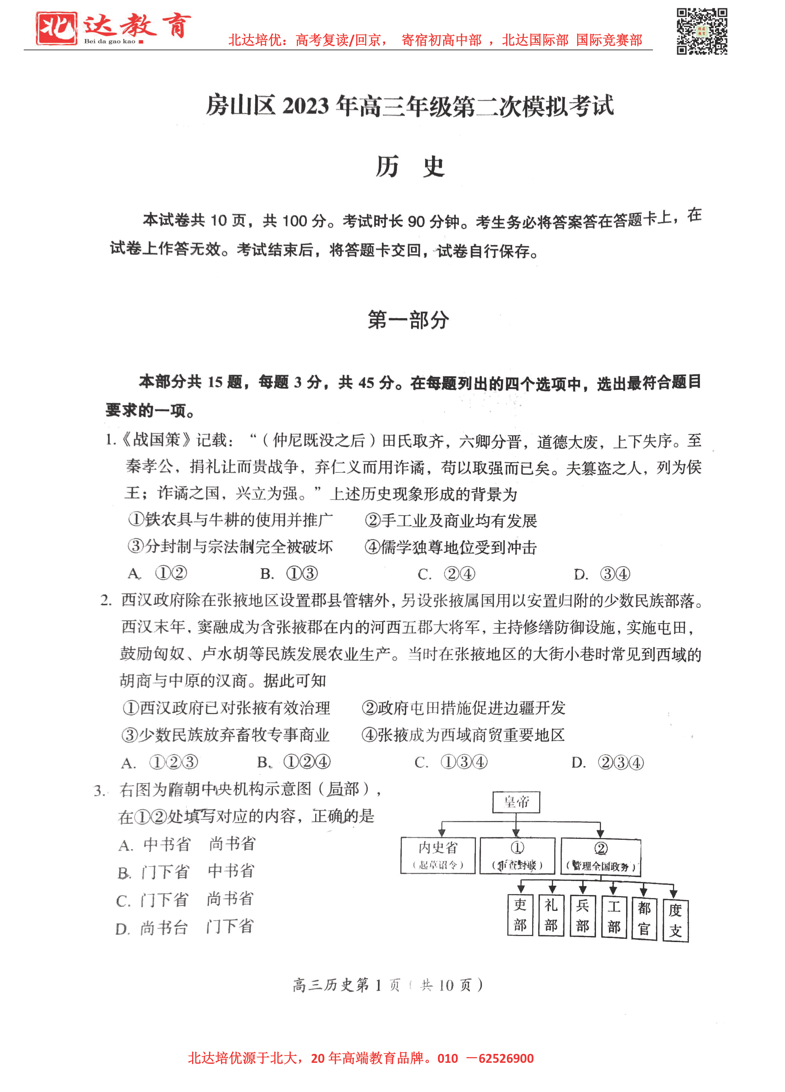 2023年北京房山区高三二模历史试题及答案