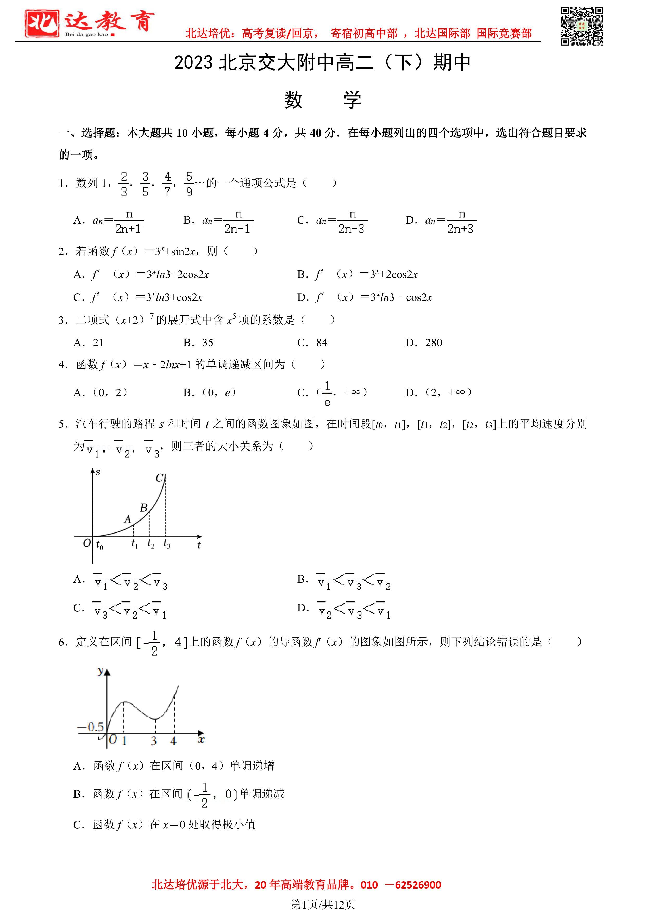 2022-2023学年北京各区高二年级下学期期中考试已开始,admw360高考复读学校整理了2022-2023学年北京交大附中高二(下)期中数学试题及答案,供同学们在线下载!