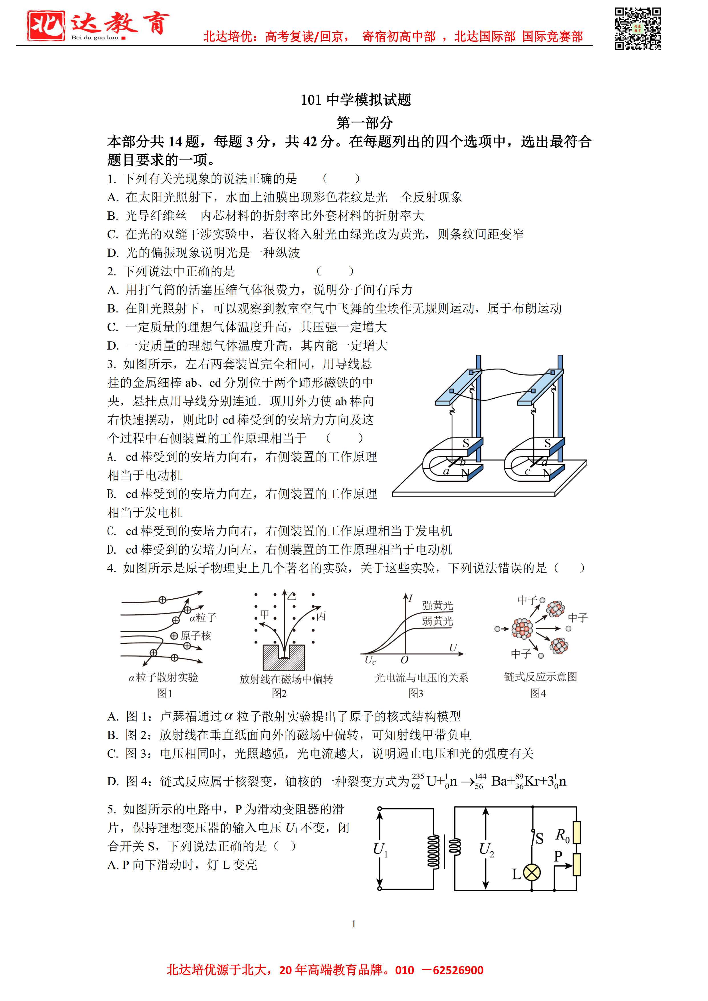 近日,北京101中学高三年级进行了三模测试,为此,admw360高考复读学校整理了物理科目试题、答案相关内容,详情如下: