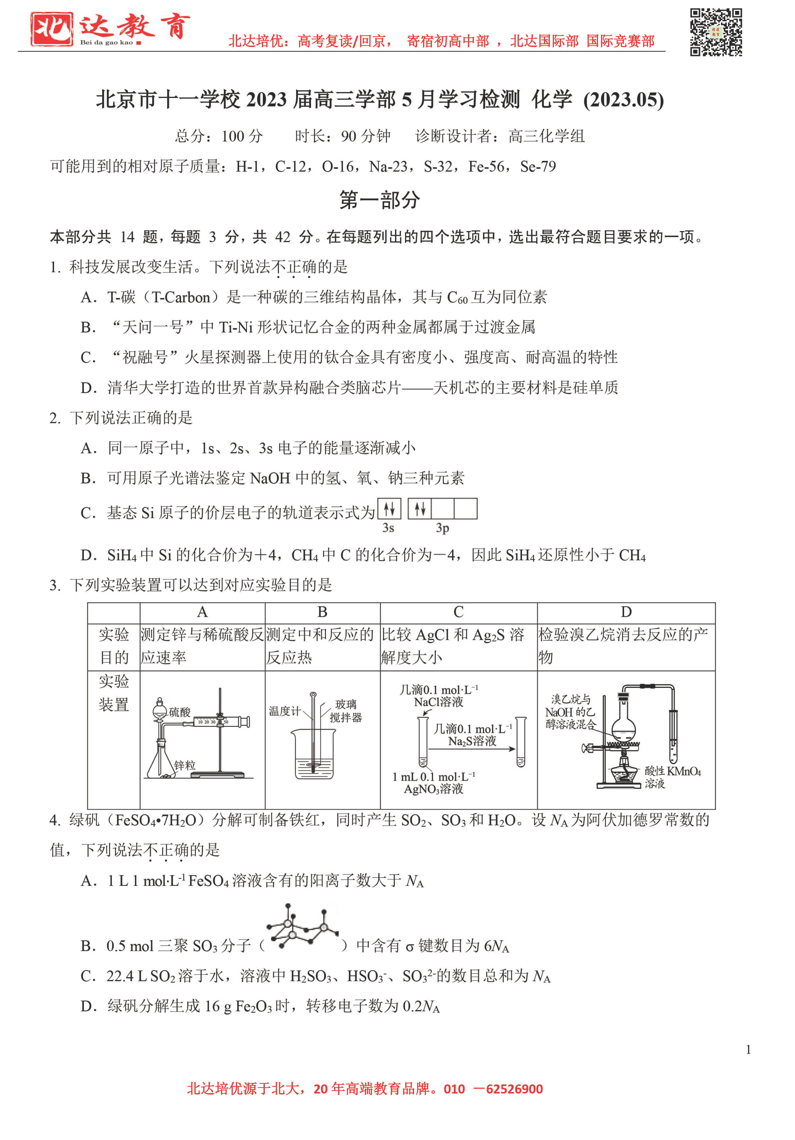 近日,北京清华附中高三年级进行了三模测试,为此,admw360高考复读学校整理了化学科目试题、答案相关内容,详情如下: