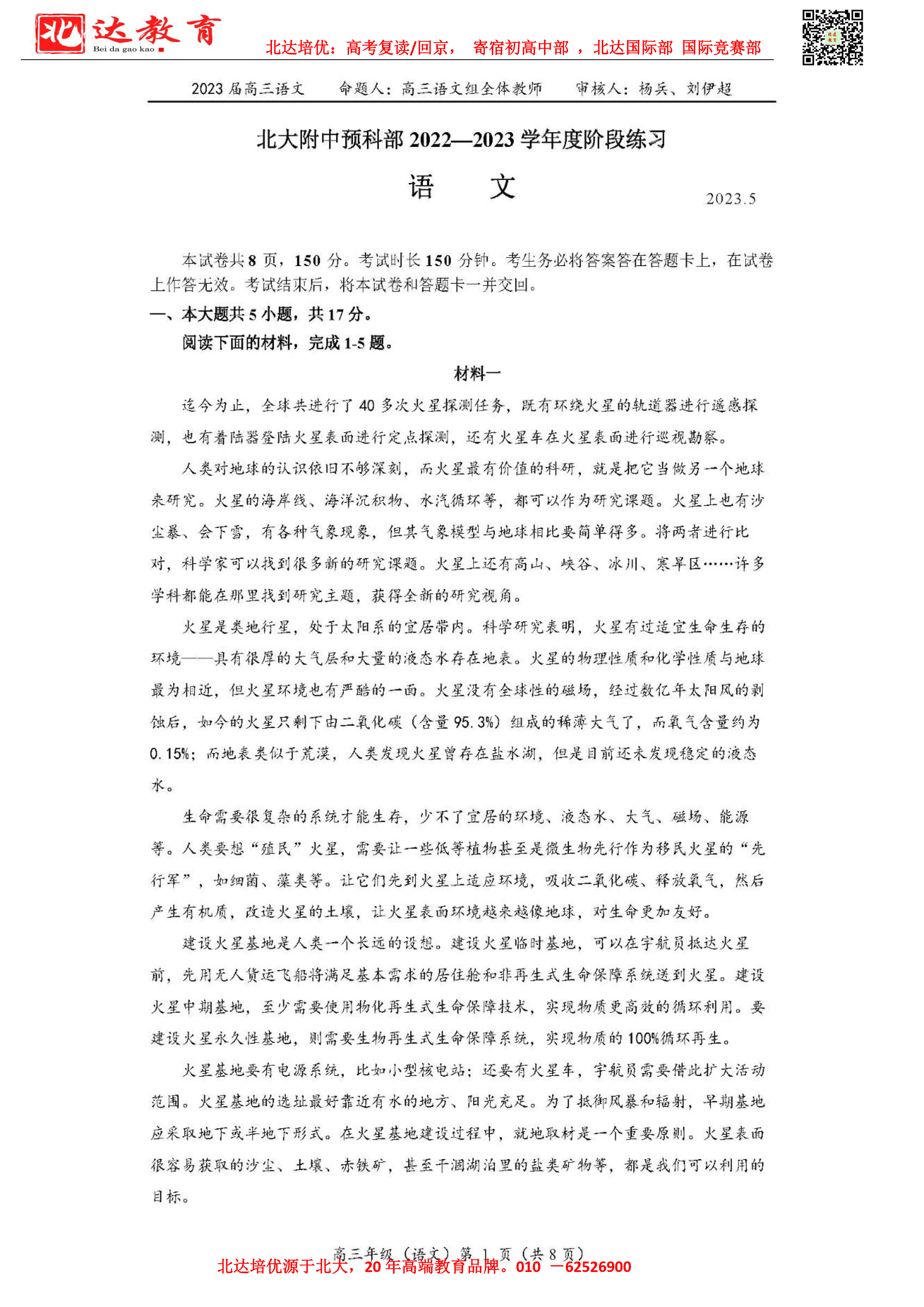 近日,北京北大附中预科部高三年级进行了三模测试,为此,admw360高考复读学校整理了语文科目试题、答案相关内容,详情如下: