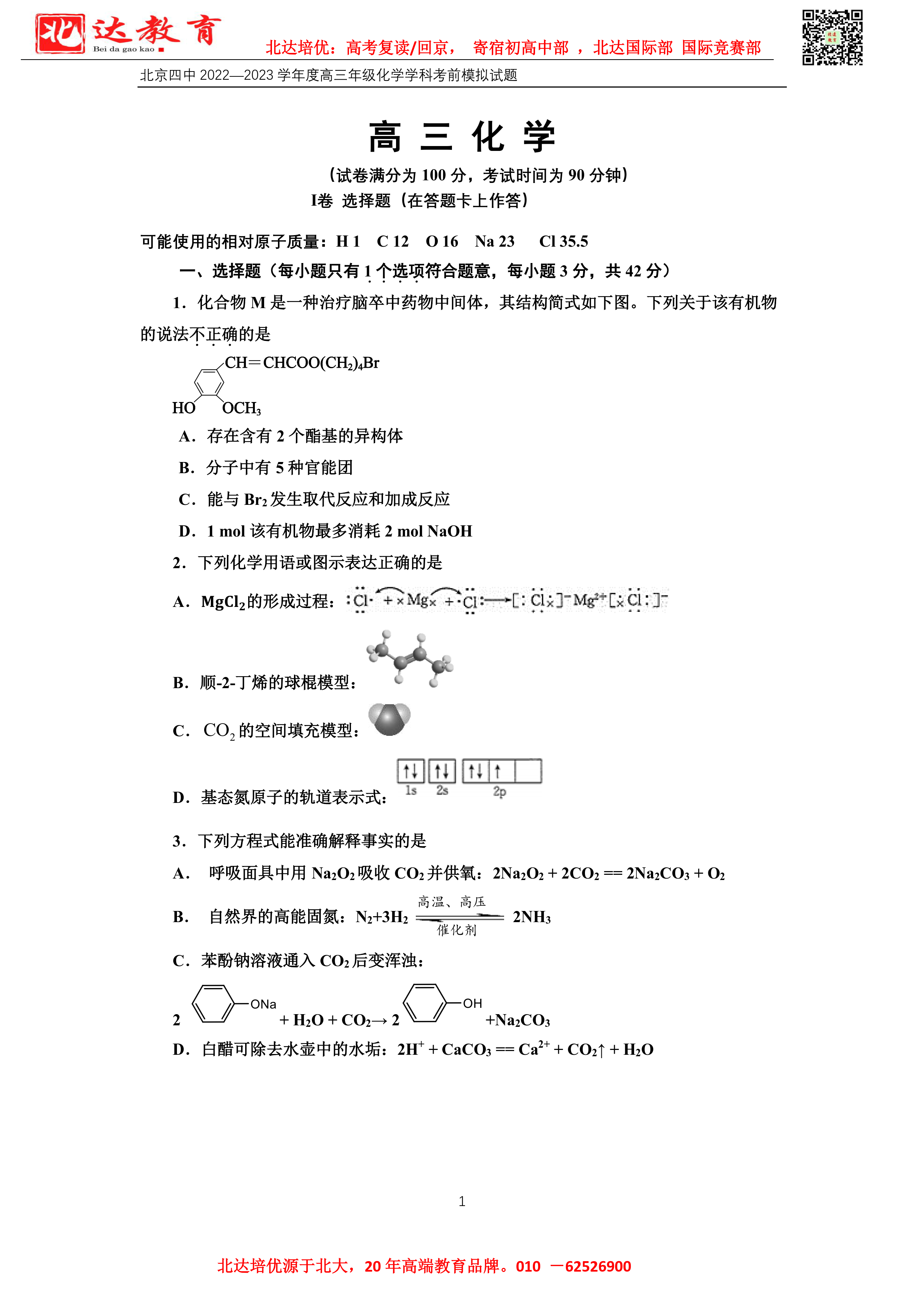 近日,北京四中高三年级进行了三模测试,为此,admw360高考复读学校整理了化学科目试题、答案相关内容,详情如下: