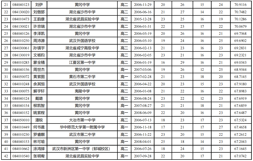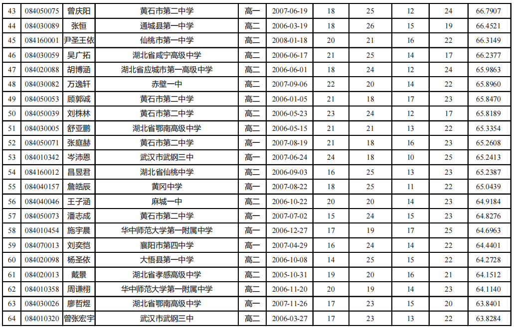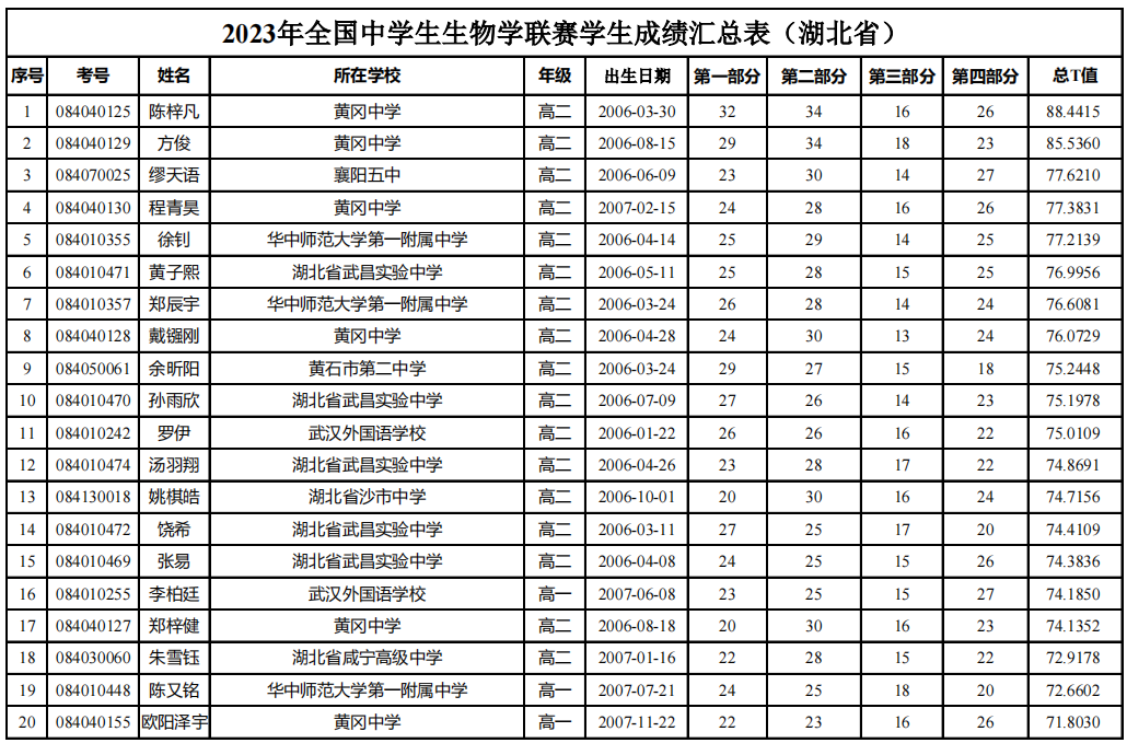 完整名单:2023年全国中学生生物学联赛学生成绩汇总表(湖北省)