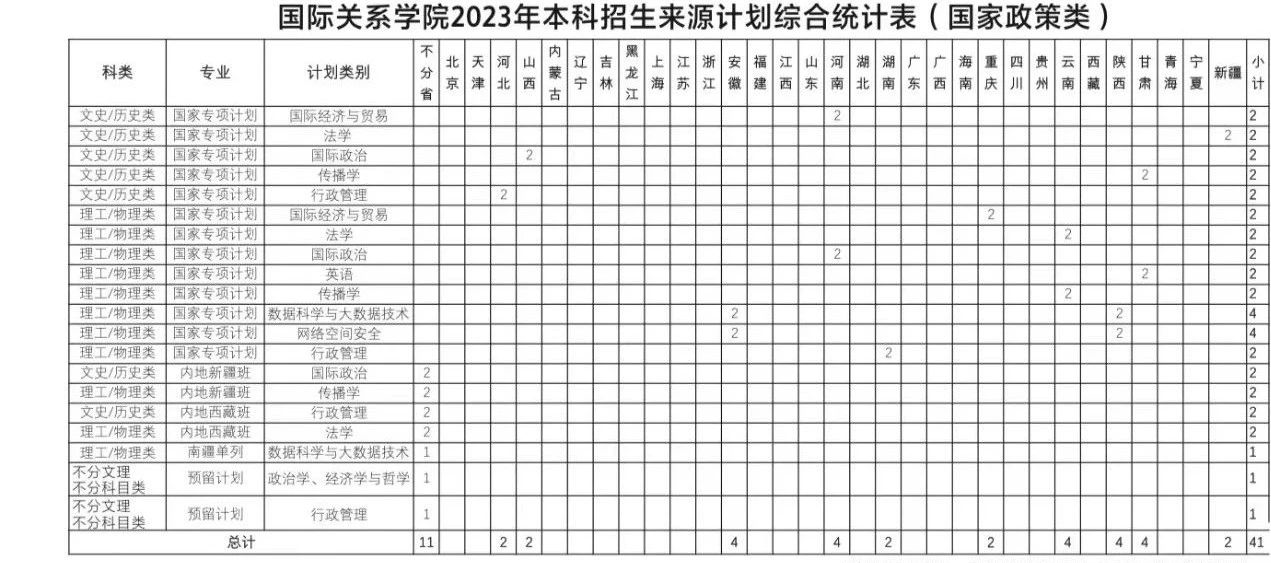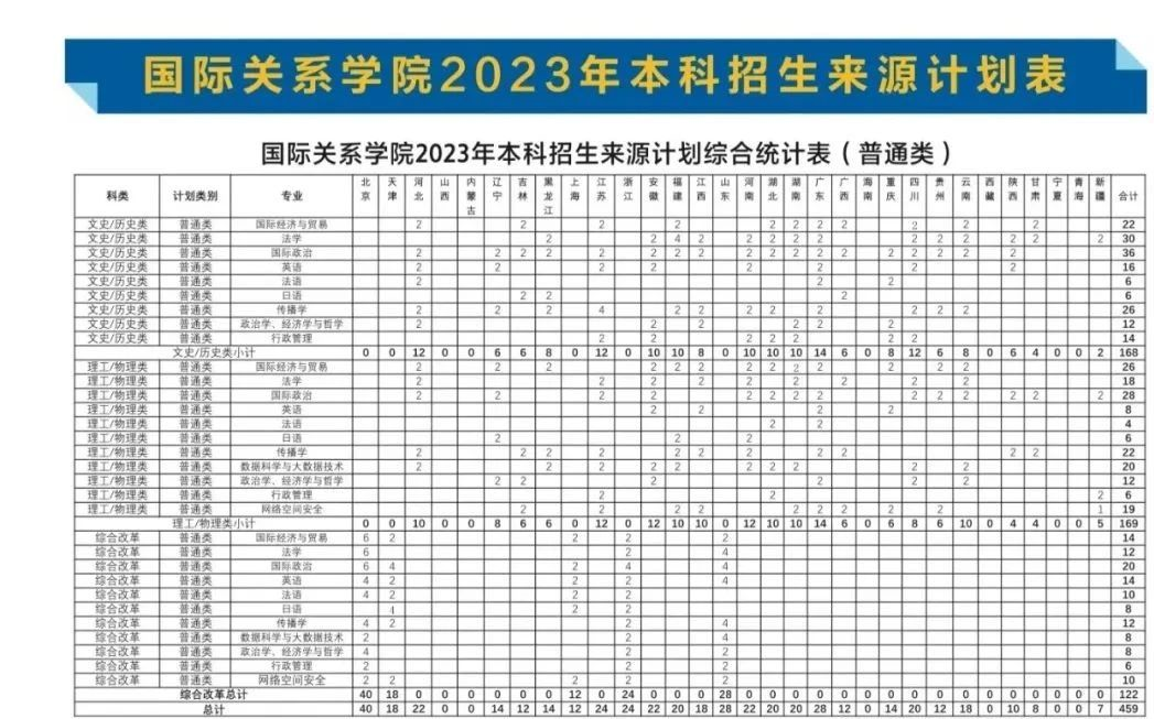 6月6日,国际关系学院公布了2023年本科招生计划表,admw360高考复读学校整理了相关内容,详情如下: