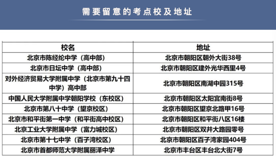 一些考点校有多个不同校区,考生要仔细了解自己要到哪个校区参加考试。比如,北京市第八十中学考点设在望京校区,北京工业大学附属中学考点设在富力城校区等。