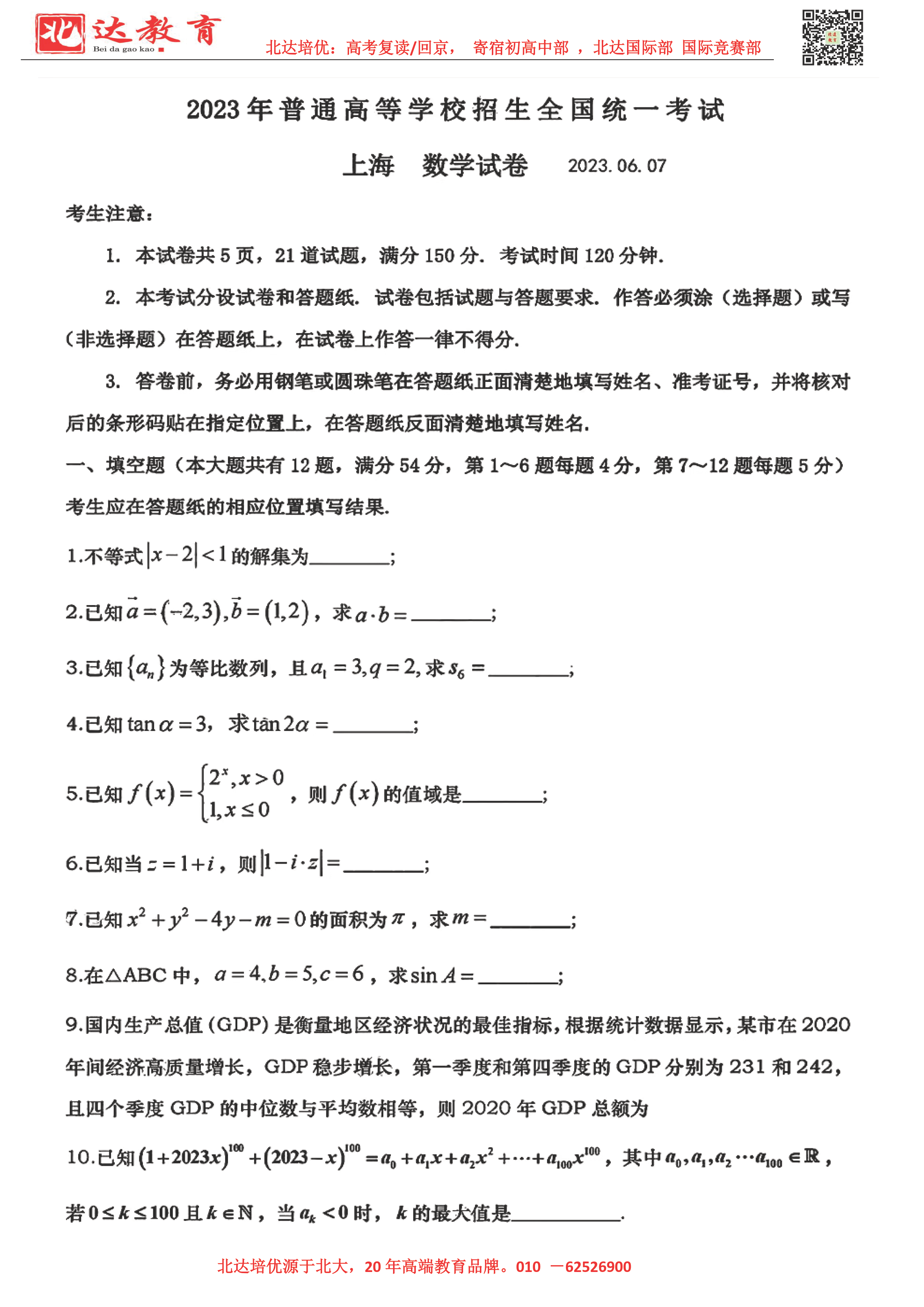2023全国高考考试已结束,为了方便同学们查找高考试题答案进行估分,admw360复读学校整理了上海卷数学试题及答案,分享给同学们。详情如下: