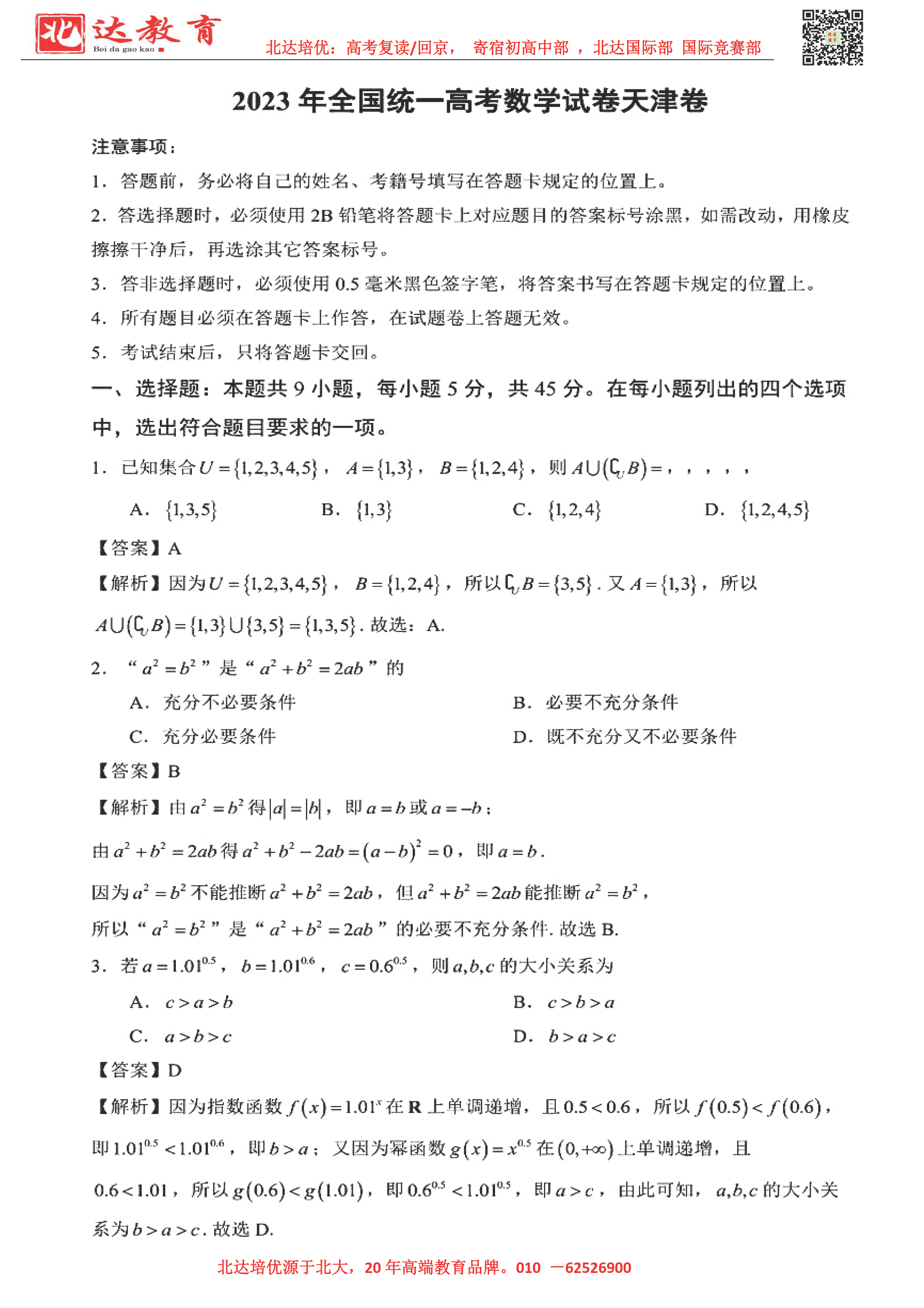 2023全国高考考试已结束,为了方便同学们查找高考试题答案进行估分,admw360复读学校整理了天津卷数学试题及答案,分享给同学们。详情如下: