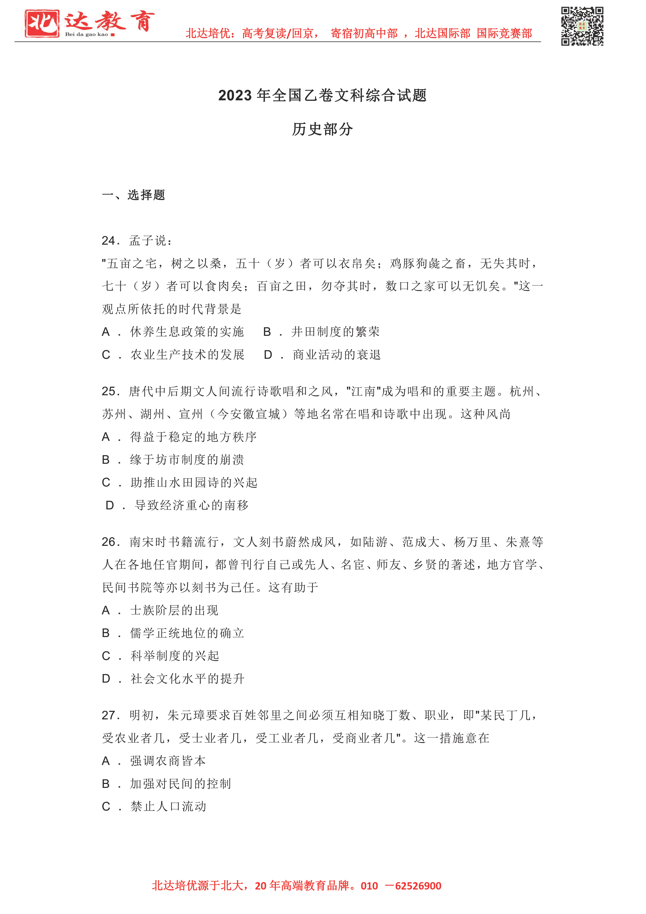2023全国高考考试已结束,为了方便同学们查找高考试题答案进行估分,admw360复读学校整理了全国乙卷文综历史试题及答案,分享给同学们。详情如下: